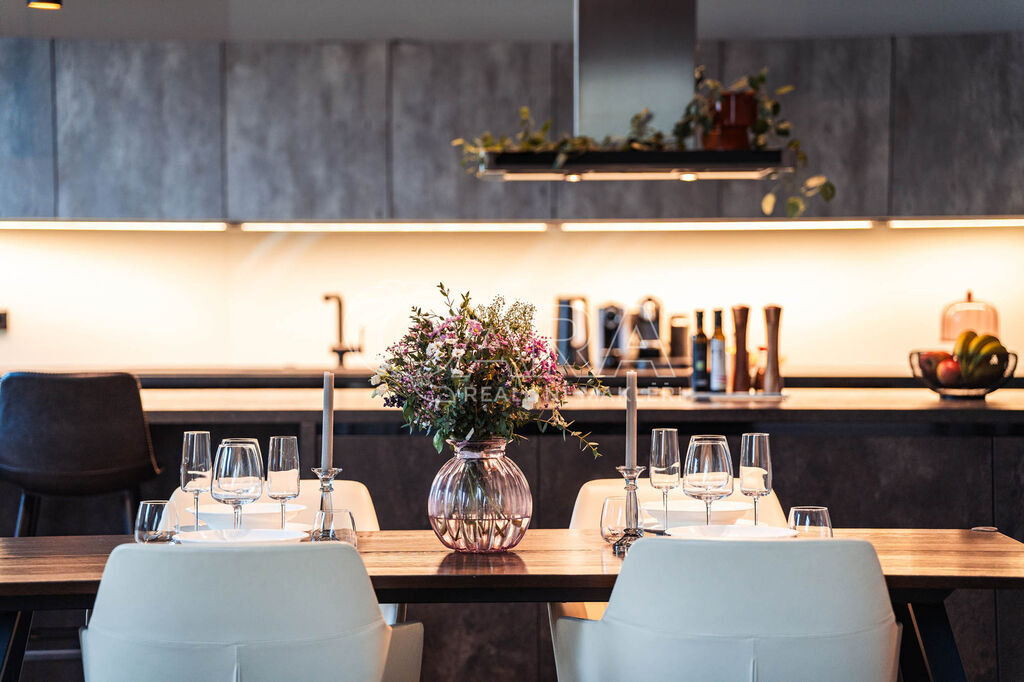 Dominantou bytu je mimořádně prostorný obývací pokoj, přirozeně propojený s plně vybavenou kuchyní a elegantní jídelnou. Dispozice zahrnuje hlavní ložnici, dětský pokoj, pokoj pro hosty, další pokoj, dvě samostatné šatny a tři komfortní koupelny – každá s kvalitním vybavením, vanou či sprchovým koutem. Velkorysá vstupní hala nabízí nadstandardní úložné prostory díky vestavěným skříním.