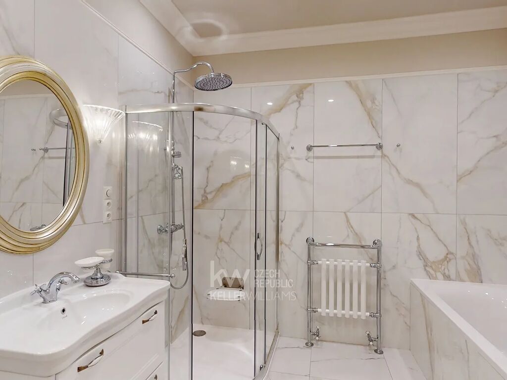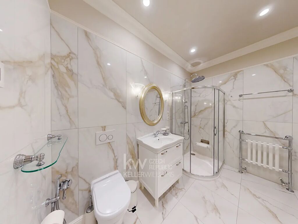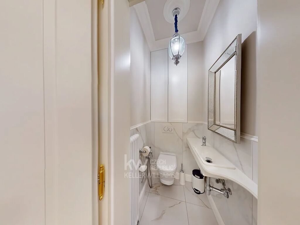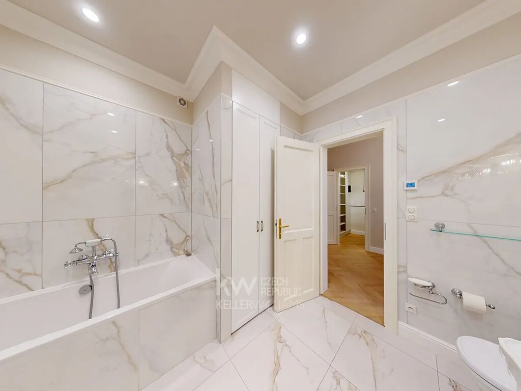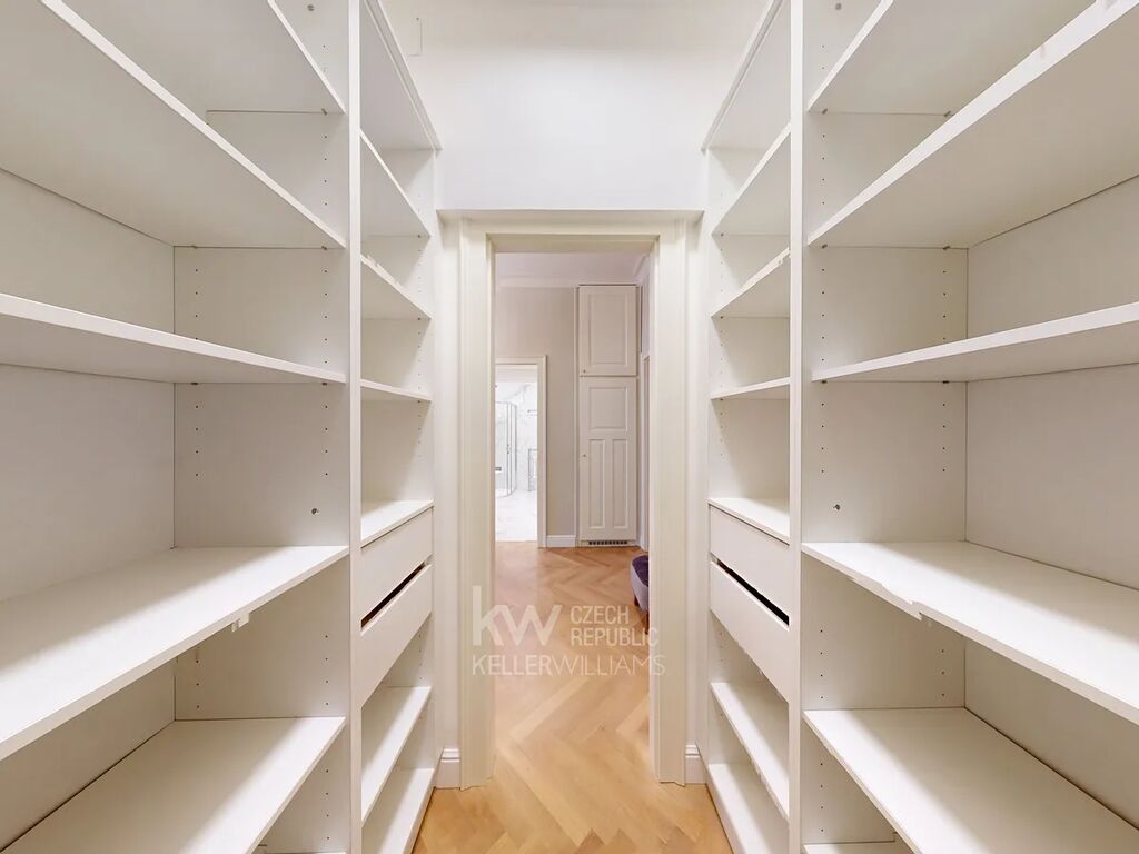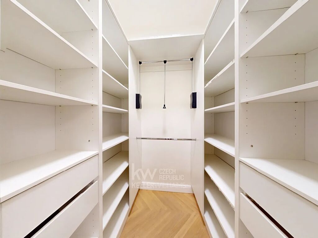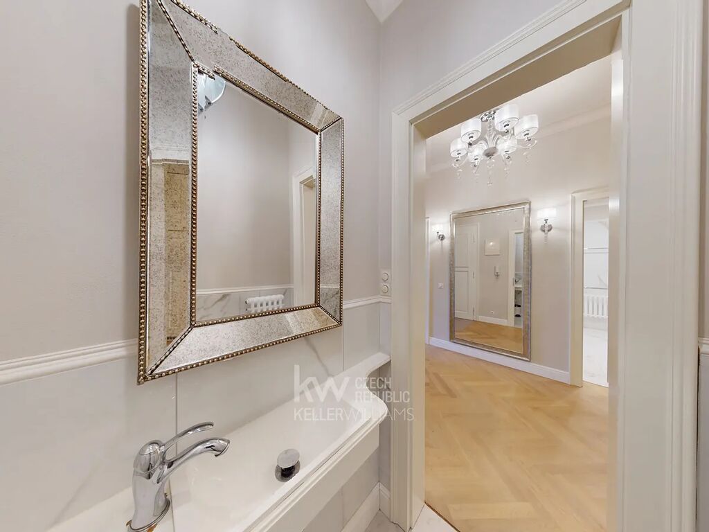 Prostorná vstupní hala podtrhuje nadčasovou eleganci celého bytu, doplněná velkým designovým zrcadlem, nástěnnými svítidly a stylovým lustrem. Praktickou součástí je samostatná walk-in šatna s množstvím úložného prostoru. Celý byt zdobí kvalitní dřevěné parkety, které umocňují luxusní atmosféru.