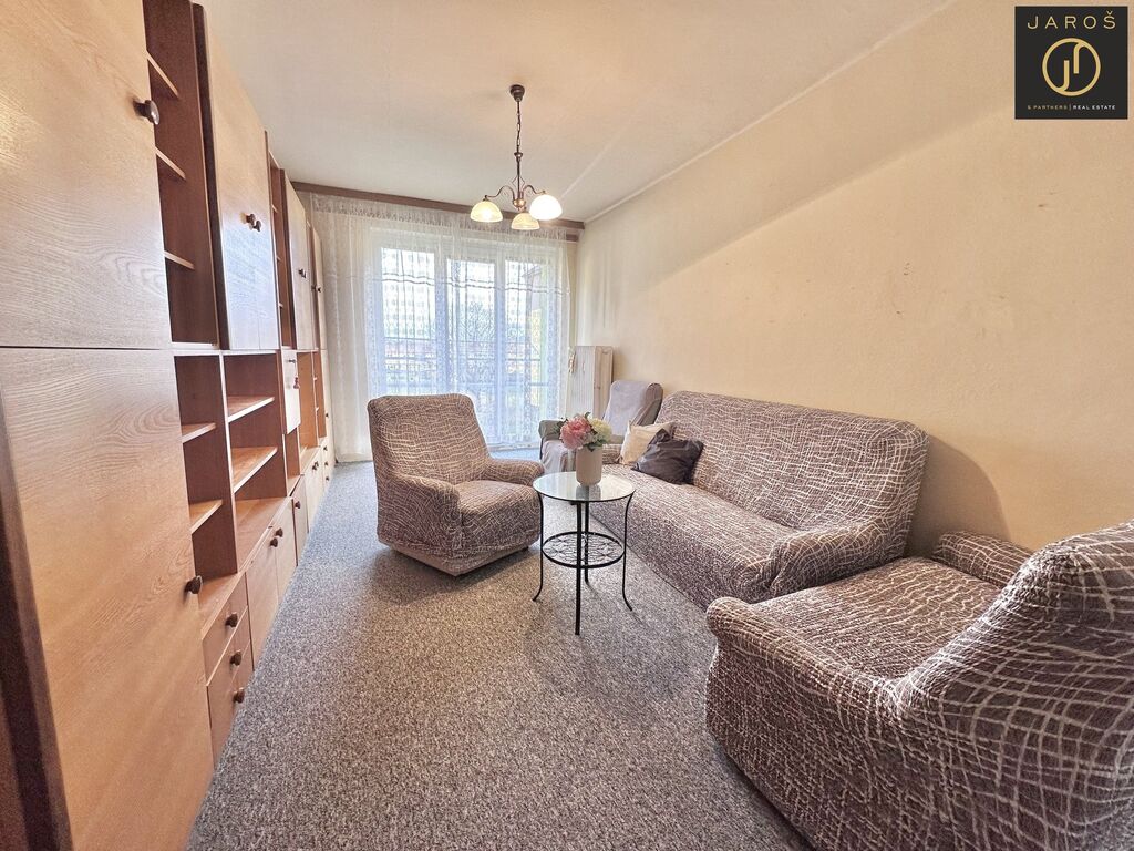 Velký a prostorný obývací pokoj s francouzskými okny přináší do bytu množství denního světla a působí vzdušně. I když není k dispozici klasický balkon, prostor u oken lze efektivně využít například pro sušení prádla nebo pěstování rostlin.