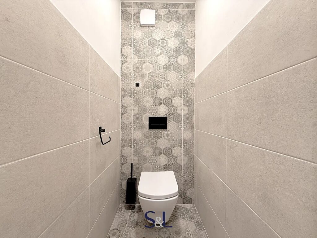 Koupelna se sprchovým koutem i samostatné WC s podlahovým topením, připojení na pračku a sušičku elegantně vyřešeno v chodbě do výklenku. Vchodové bezpečností dveře s akustickou vložkou, plastová okna se žaluziemi.