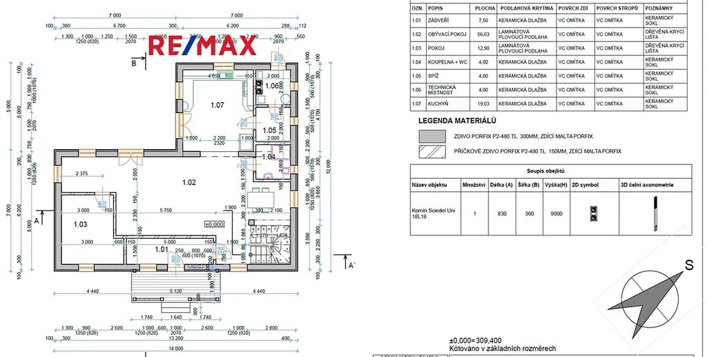 Zastavěná plocha rodinného domu je 141,36 m2. Velikost domu je cca 13,7/14 m. Výška objektu 7,65 m.