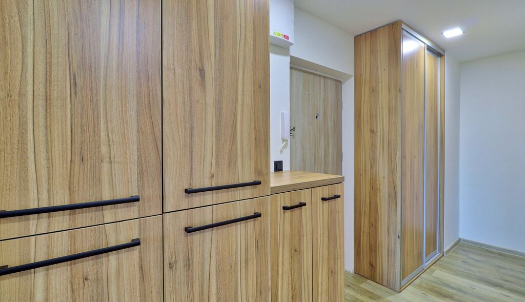 Byt je zařízen skříněmi na chodbě a v ložnici. Součástí vybavení je kuchyňská linka s vestavnými spotřebiči.