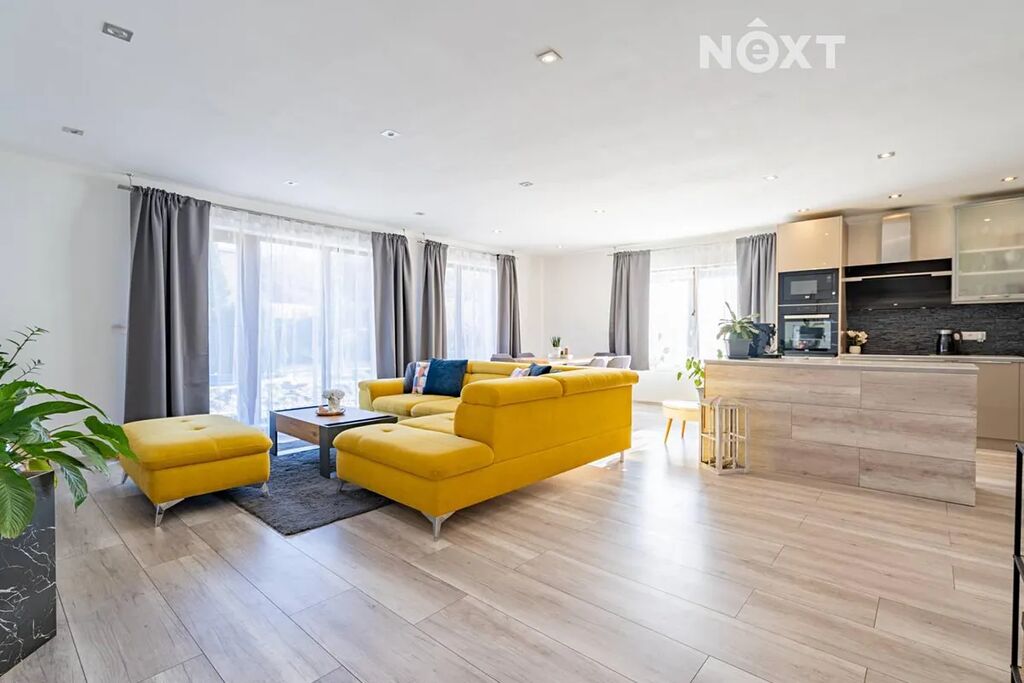 Dům má zastavěnou plochu 216 m². Po vstupu se nachází zádveří se samostatnou šatnou, odkud vede vstup do velmi prostorného obývacího pokoje s velkými francouzskými okny orientovanými do zahrady. Obývací pokoj je propojen s kuchyní, která nabízí dostatek úložného prostoru, vestavnou myčku, elektrickou troubu, mikrovlnnou troubu, indukční varnou desku i lednici. Celý interiér působí vzdušně, je plný přirozeného světla a nabízí příjemnou domácí atmosféru. Z obývacího pokoje lze vstoupit do dětského pokoje.