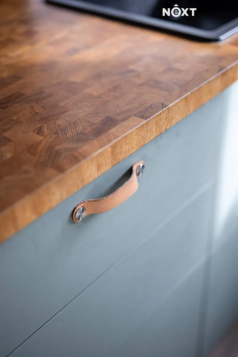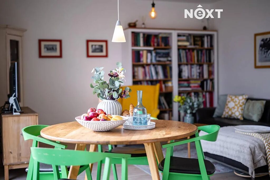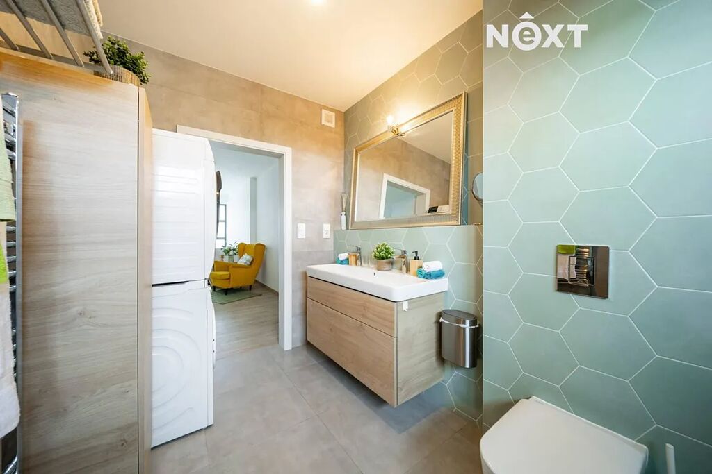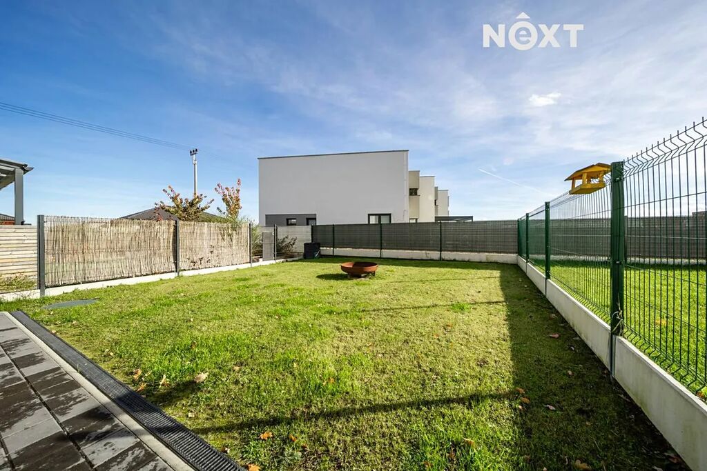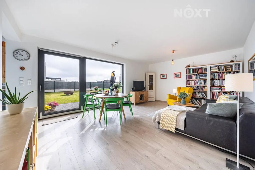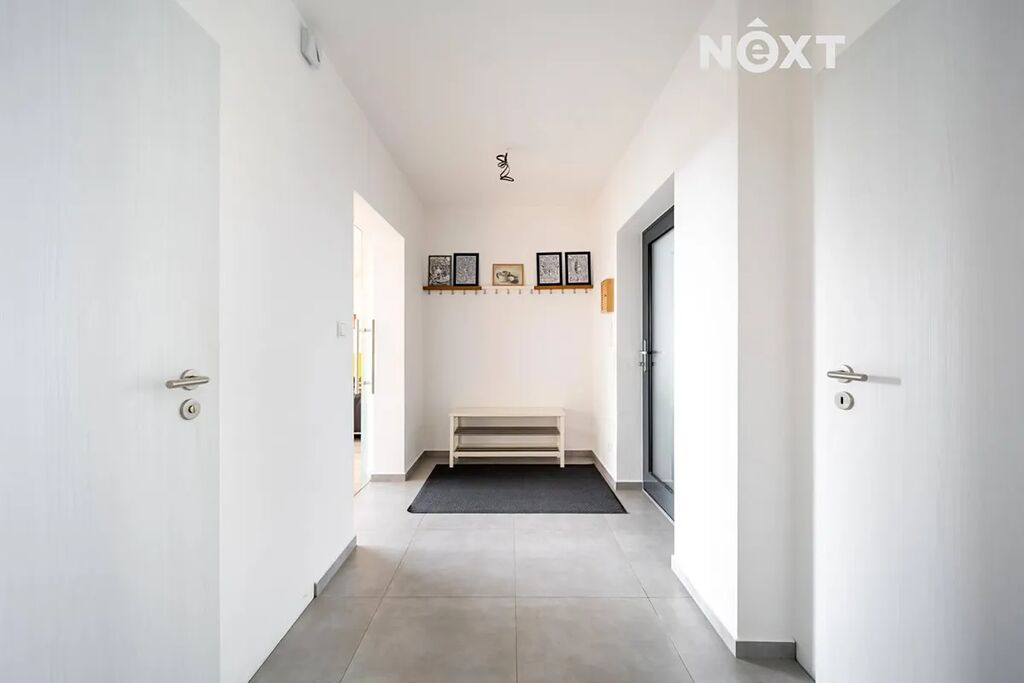 Při příjezdu k domu vás zaujmou dvě krytá parkovací stání o velikosti 23,5 m² a praktický venkovní sklad o 6,99 m², ideální na kola nebo sportovní vybavení. Vstupní hala o 8,79 m² navazuje na světlý obývací pokoj s kuchyňským koutem o 34,25 m², který je srdcem celého domu. Kuchyně je výrazným designovým prvkem – masivní dřevo, kožené úchytky, ručně působící detaily a mimořádně příjemná barevnost tvoří prostor, který působí domácky a zároveň moderně. Z obývací části vedou velké prosklené dveře na terasu o 8,23 m² a na zahradu, které díky své orientaci přivádějí do interiéru dostatek denního světla po celý den.