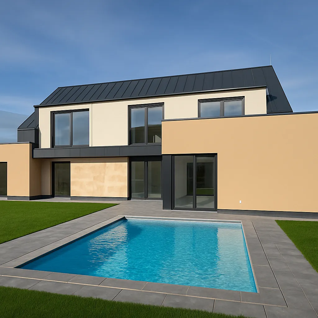 Dům disponuje moderními technologiemi pro úsporný provoz a zdravé vnitřní klima – včetně plynového kotle, retenční nádrže na dešťovou vodu a přípravy pro instalaci fotovoltaického systému. Fasáda domu je obložena přírodním kamenem, který podtrhuje jeho elegantní a nadčasový vzhled.