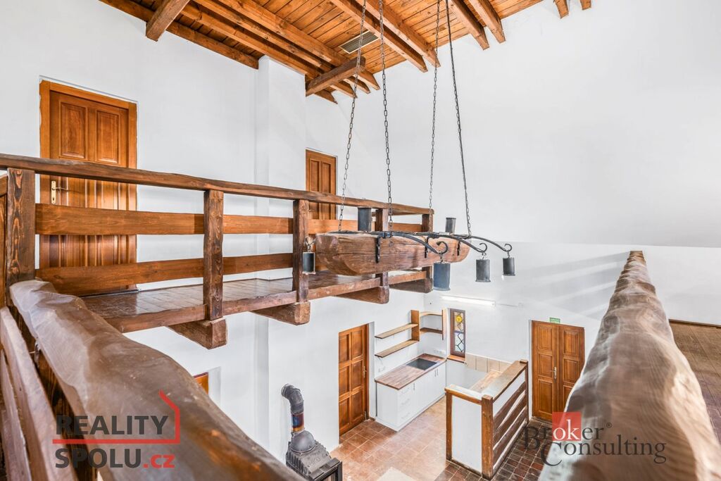 Dominantou celého domu je impozantní centrální místnost s vysokým stropem o velikosti 60,5 m², která přímo vybízí k vytvoření velkorysého obývacího pokoje s kuchyní. Dřevěné schodiště z této části vede do patra, kde se nachází unikátní balkon z masivních trámů, obepínající tři strany místnosti. Tento prostor nabízí dalších 38,7 m² a podtrhuje výjimečnost interiéru.