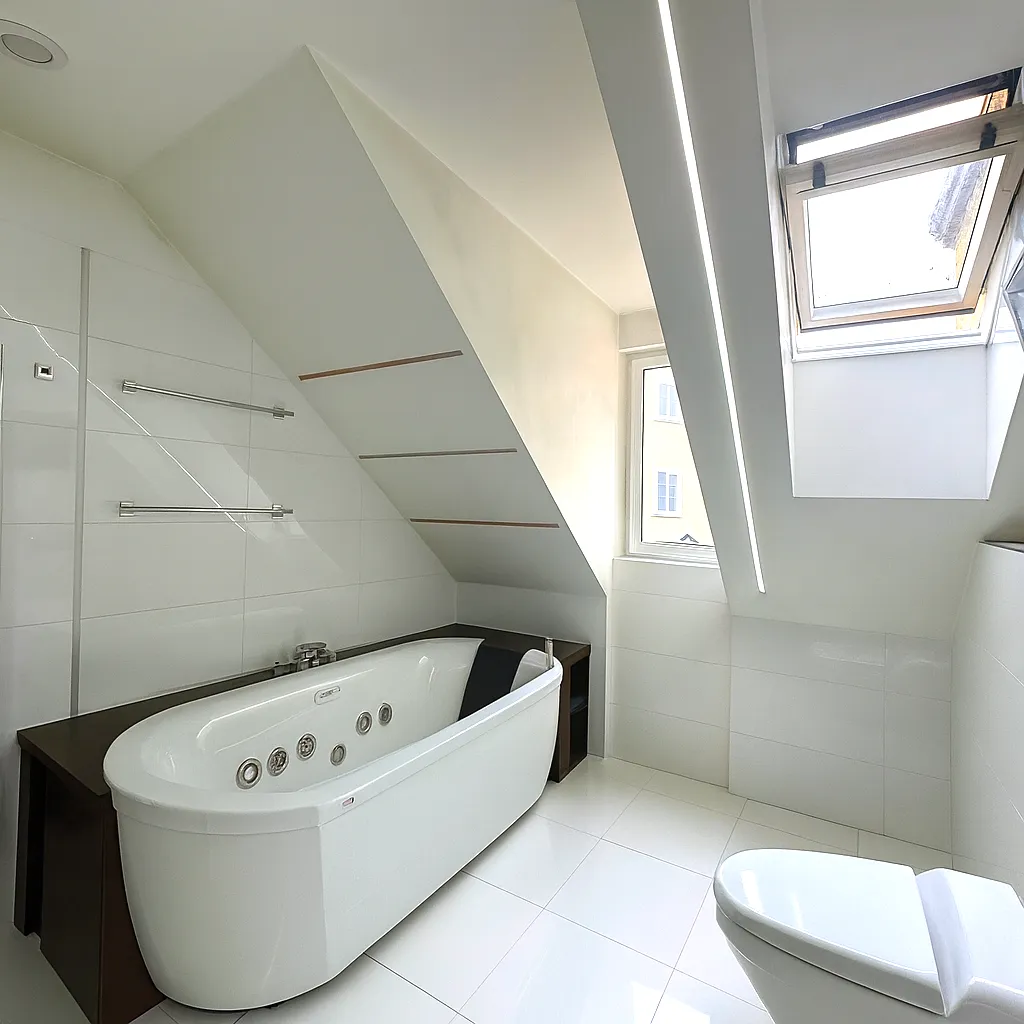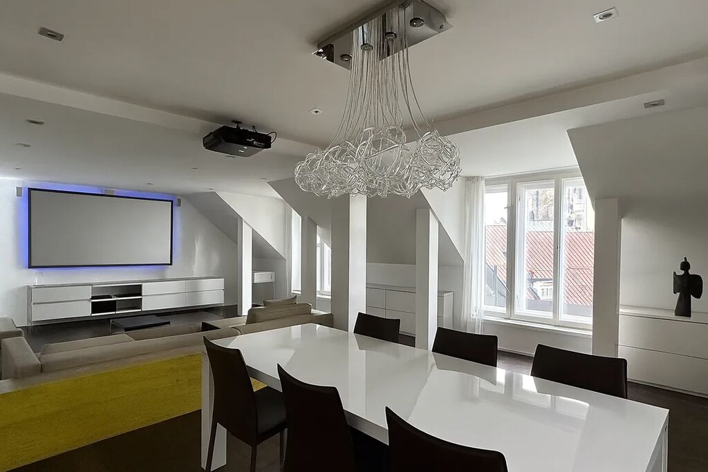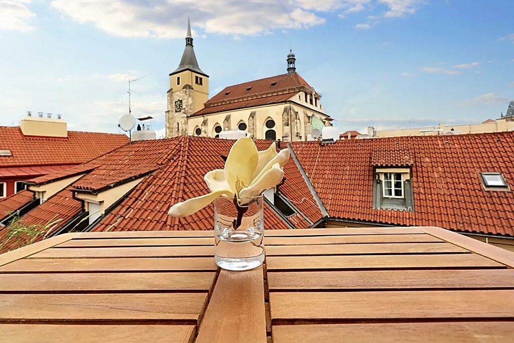 Byt se pyšní panoramatickým 360° výhledem na celou Prahu a prošel kompletní renovací před šesti lety. Po vstupu do bytu vás přivítá předsíň, ze které se po několika schodech dostanete do soukromého wellness se saunou. Hlavní obytný prostor tvoří prostorný obývací pokoj s mramorem obloženým krbem a plně vybavenou kuchyní značky Miele, kde stěny zdobí elegantní benátský štuk. Snídaně si můžete vychutnat na jednom ze dvou balkonů s působivým výhledem na historické památky Starého Města.