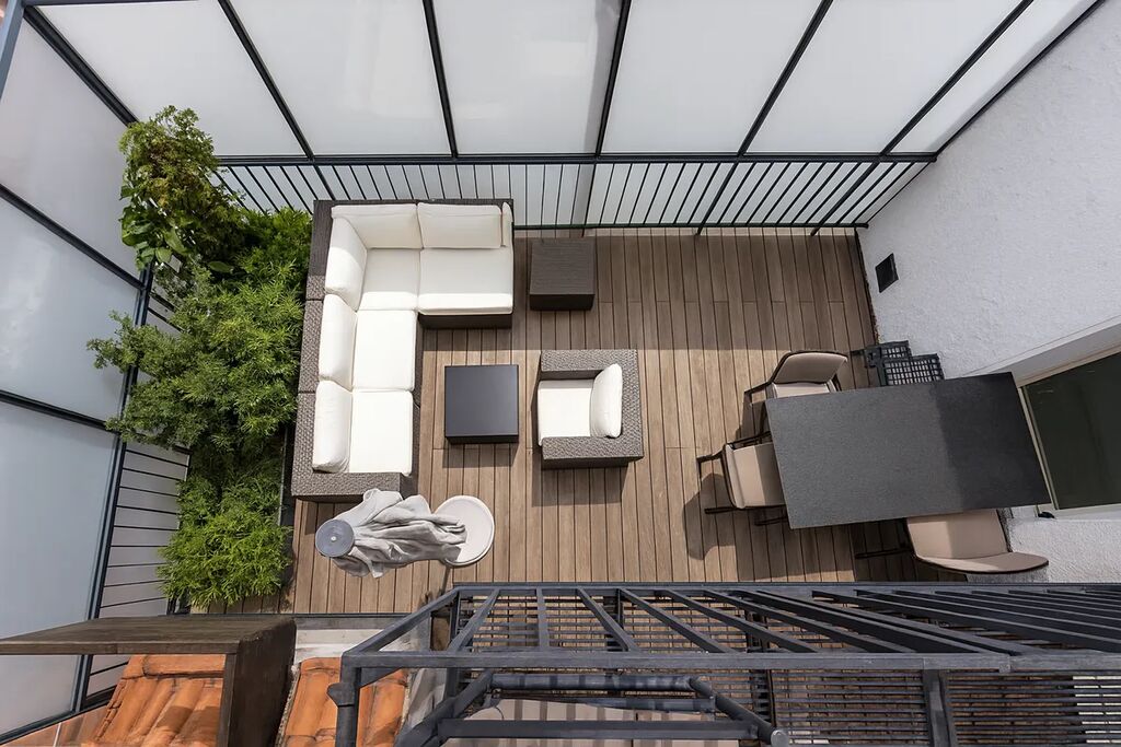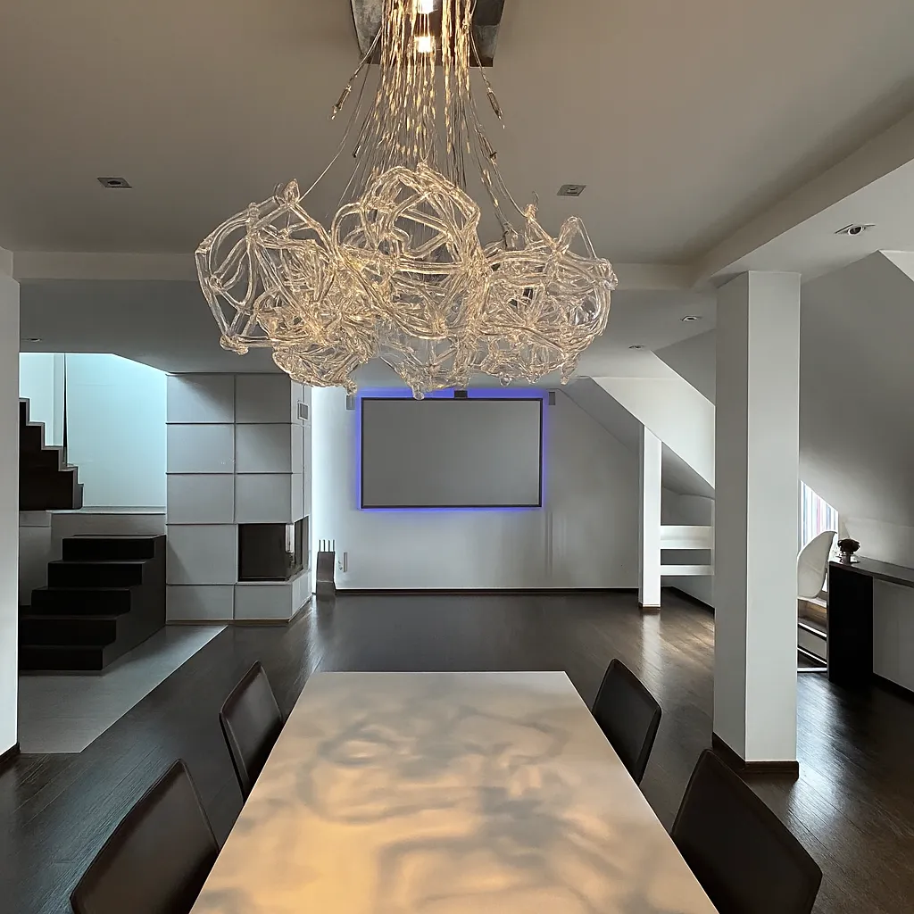 Byt je vybaven špičkovým ozvučením, masážní vanou, filmovým plátnem s projektorem a dalšími nadstandardními prvky. Klimatizace a automatická závlaha na terasách přispívají k maximálnímu komfortu. K bytu náleží dva sklepy. Nemovitost vyhrála architektonickou cenu roku.