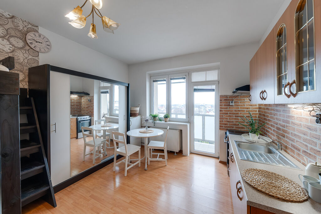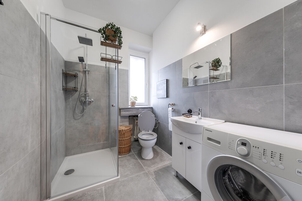 Byt se nachází v 5. patře revitalizovaného domu s výtahem. K dispozici budete mít kuchyňskou linku se spotřebiči – lednice, elektrická trouba se sklokeramickou varnou deskou a digestoří. Koupelna je vybavena sprchovým koutem, koupelnovou skříňkou se zrcadlem a WC.