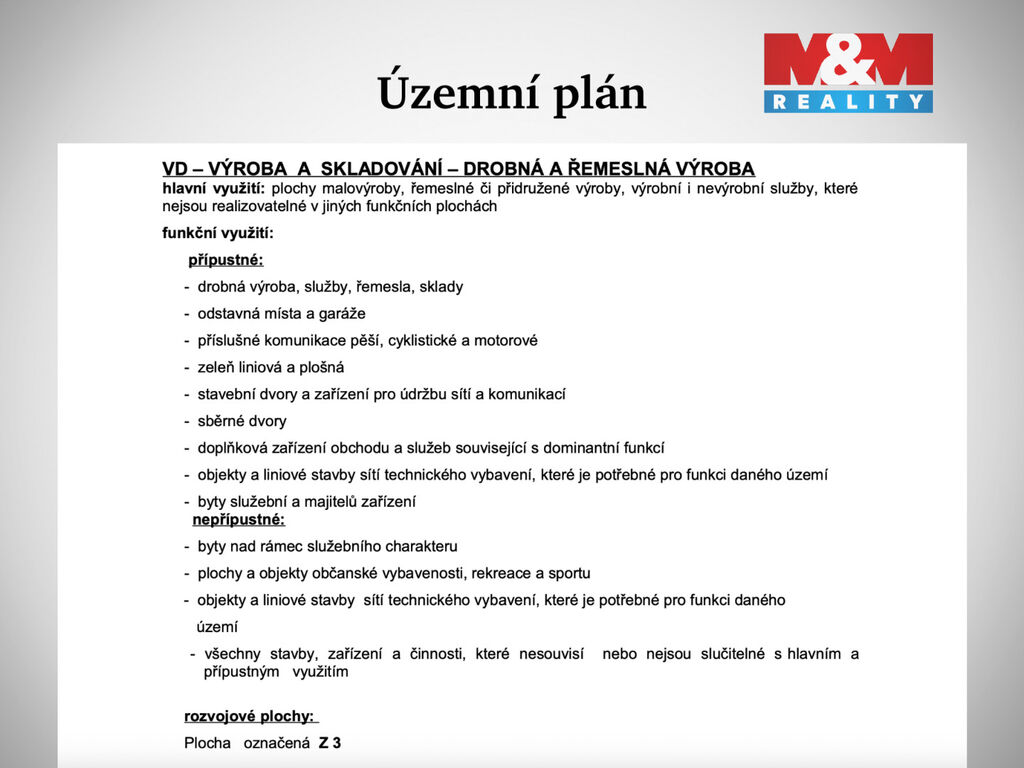Územní plán umožňuje využití pro výrobu a skladování, výstavbu bytů sloužících zaměstnancům či majitelům, drobnou řemeslnou činnost či služby.