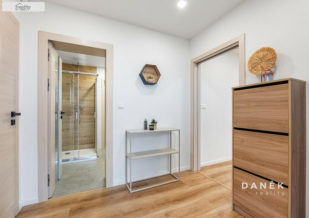 Interiér byl navržen s důrazem na detail, kvalitu a funkčnost – nabízí vyšší standard, než bývá běžně. Vinylové podlahy v celém domě. Designová kuchyně na míru, která je plně vybavená spotřebiči. Vestavěný nábytek, dýhované dveře Sapeli a kvalitní obklady. HS portál v antracitu – propojuje obývací prostor s terasou. Dvě koupelny – jedna s vanou, druhá se sprchovým koutem. Vinylový obklad schodiště, betonová stěrka a precizní řemeslné detaily. V domě se snoubí elegance, praktičnost a teplo domova – každý detail byl promyšlen.