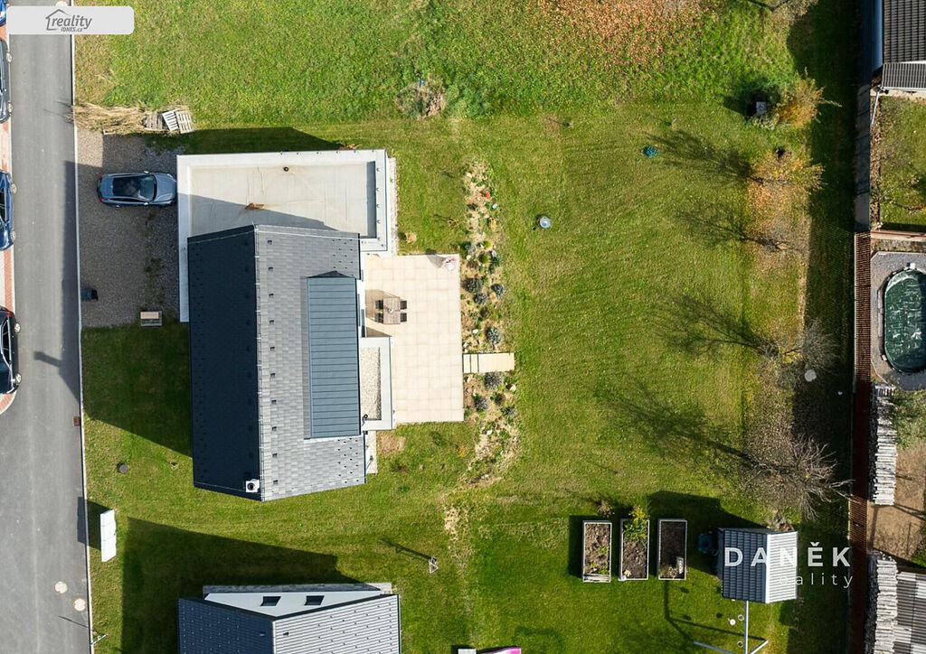 Pozemek o rozloze 907 m² nabízí dostatek prostoru pro zahradu, odpočinek i hry dětí, přitom zůstává nenáročný na údržbu. K dispozici je retenční nádrž s čerpadlem pro zavlažování, zpevněná příjezdová cesta, garáž a terasa s krásným výhledem. Ulice je velmi klidná, bez provozu a průjezdu aut – ideální pro rodinný život.