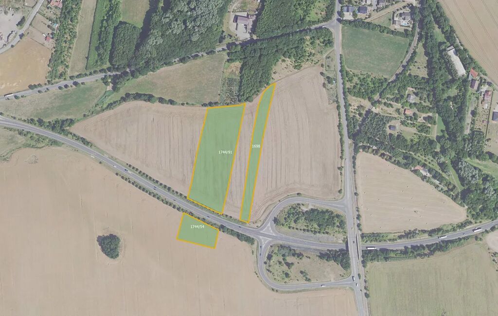 Tyto parcely leží při jižním okraji obce podél silnice I/16. Položeny jsou v absolutní rovině a i tvarem umožňují efektivní hospodaření. Jejich společná výměra je 23 250 m2, čistě orné půdy.
