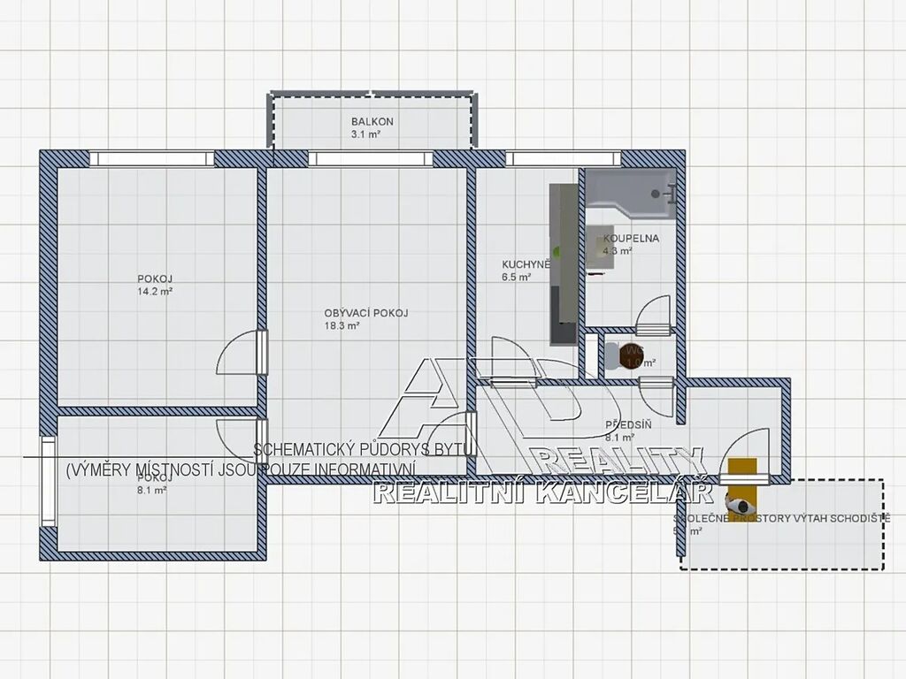 Dispozice bytu: obývací pokoj [18,4m2], samostatná ložnice [14,3m2], pokoj [8,1m2], kuchyně [6,5m2], předsíň [8,5m2], koupelna WC [5,4m2]. K bytu je k dispozici sklepní kóje v 1.NP (technické podlaží – přízemí) domu o výměře cca [2,2m2]. Topení v bytě centrální / ústřední dálkové (radiátory), podružné měření spotřeby teplé a studené vody (vodoměry), samostatné měření spotřeby elektřiny (elektroměr). V bytě je možnost připojení internetu (Starnet) a STA.