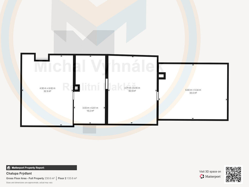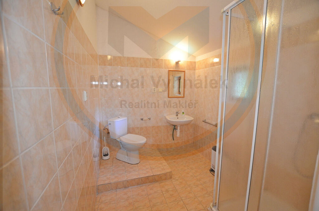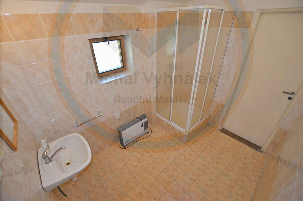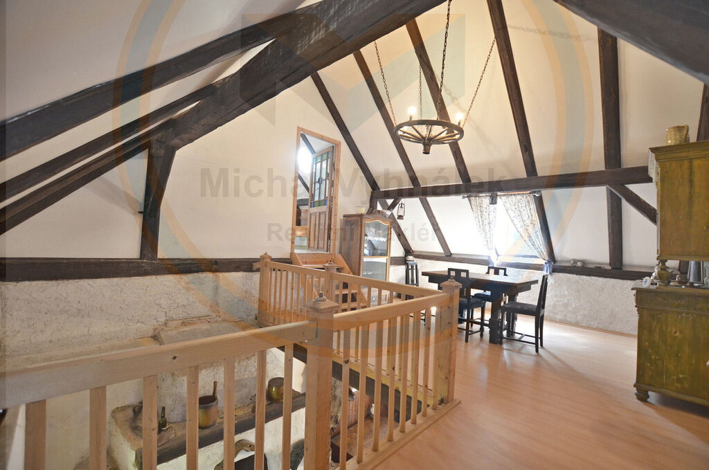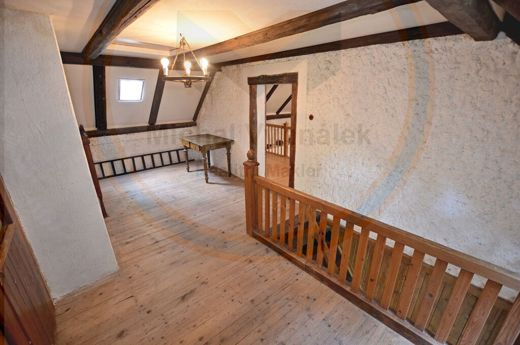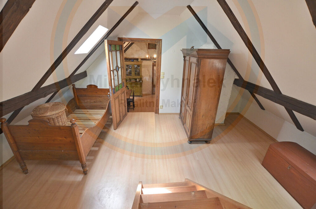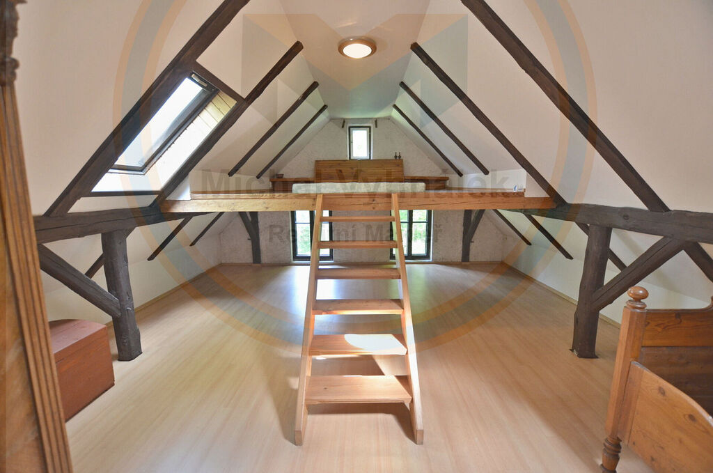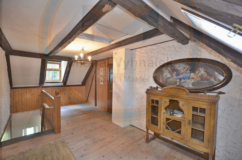Horní patro: spojuje členitá chodba využívaná jako hrací a odpočinkový prostor. Pokoj nad kuchyní (33 m²) a pokoj s vestavěným patrem na spaní (35 m²). Celé horní patro prošlo rekonstrukcí.