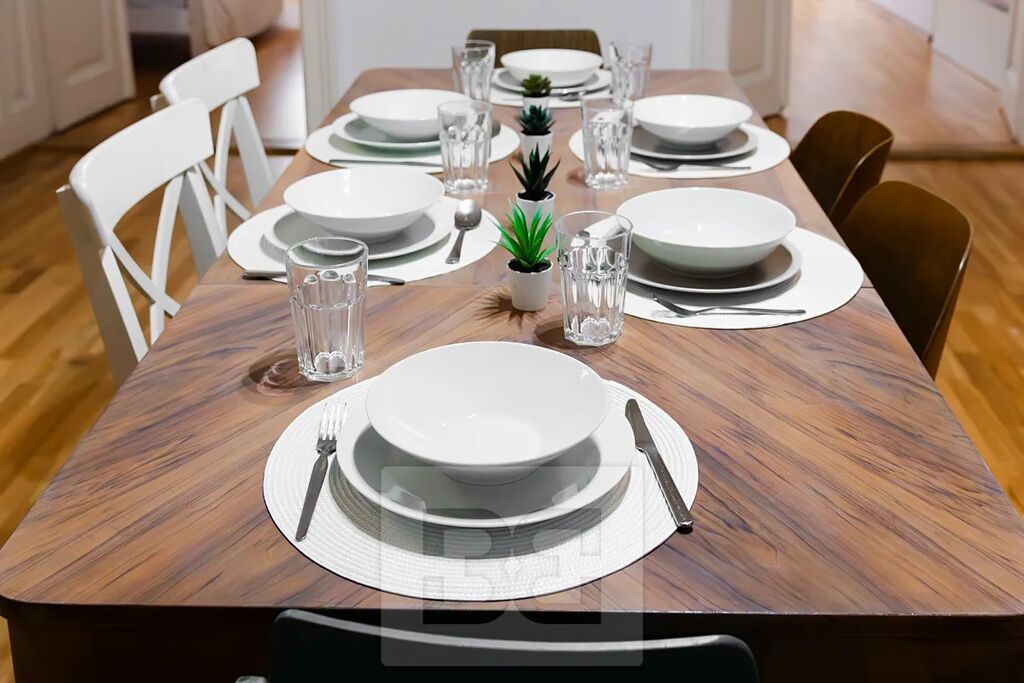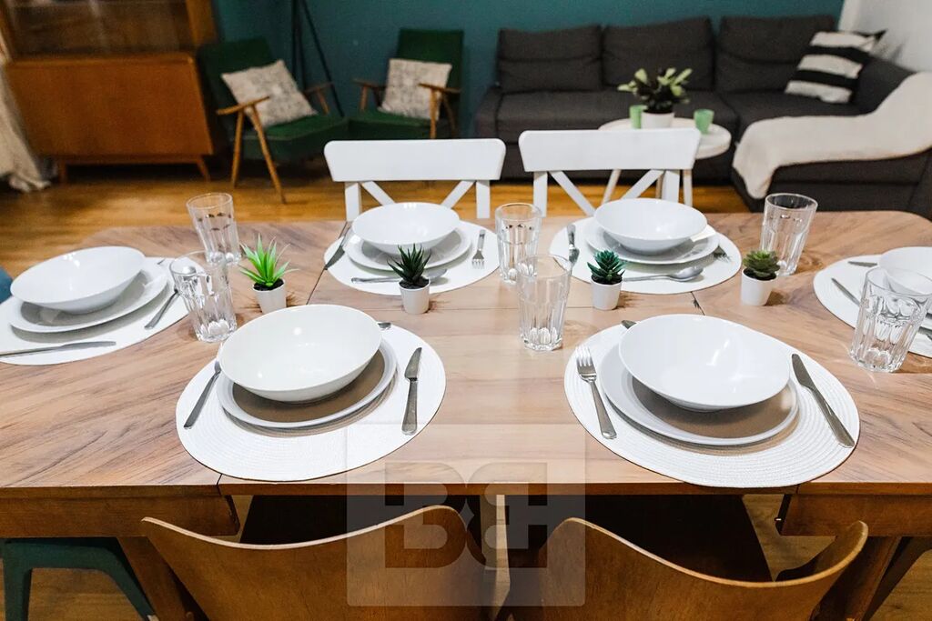 Koupelna s vanou a samostatná toaleta. Pokoje jsou prostorné s možností úložných prostor v nikách. Dvě ložnice jsou orientovány do ulice Vachova. Třetí ložnice je orientovaná do vnitrobloku. Byt je vybaven v minimalistickém stylu s retro prvky.
