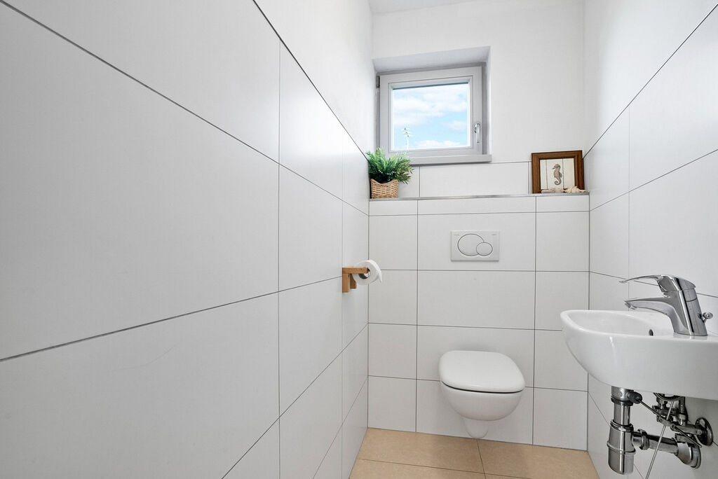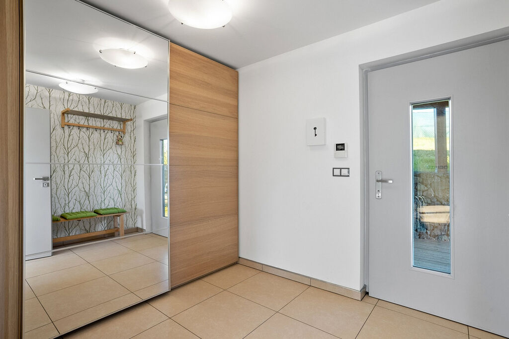 Dům má zastavěnou plochu 166 m² a velmi komfortní dispozici 4+1, kterou doplňují dvě koupelny, samostatná pracovna, šatna a velké technické zázemí.