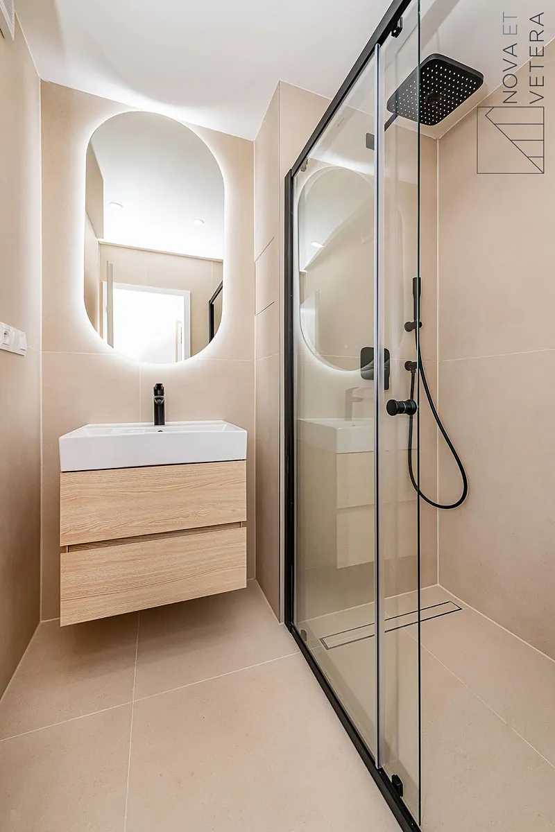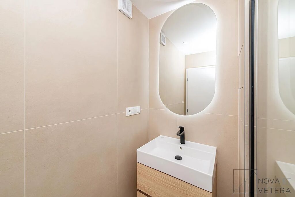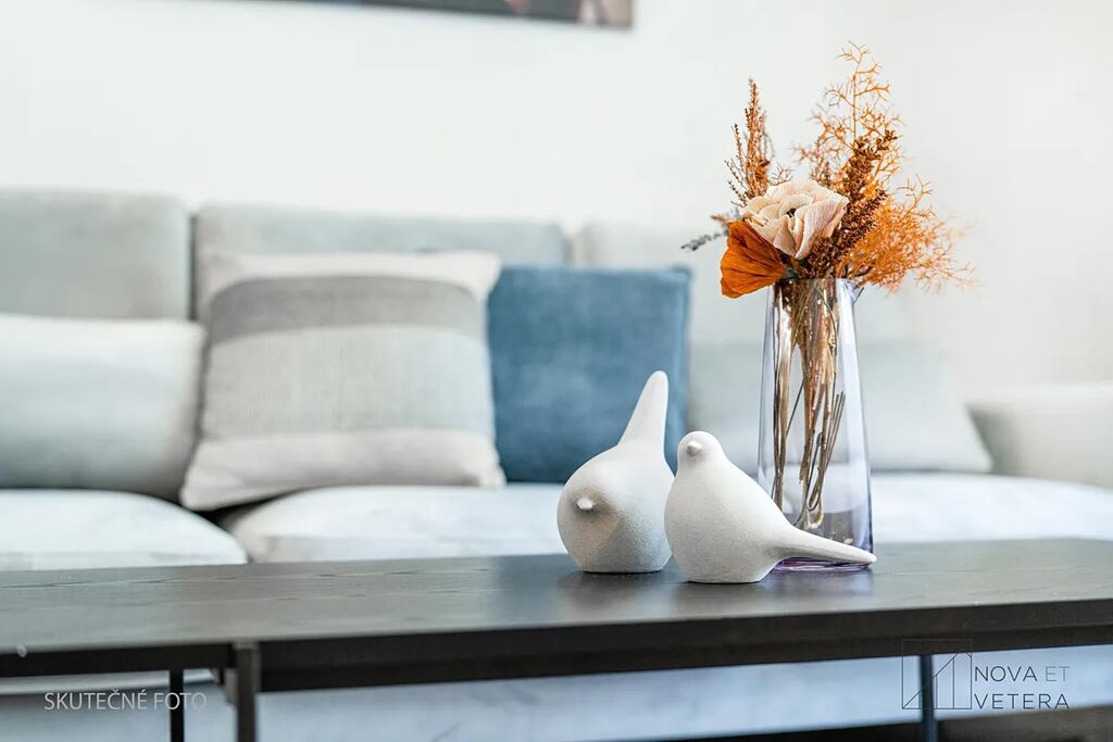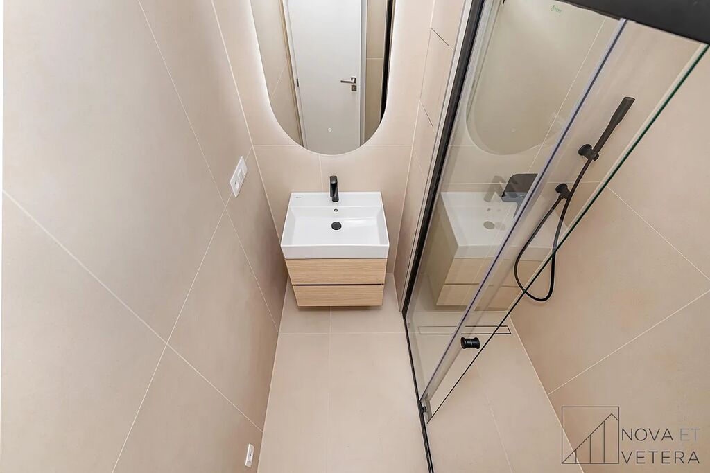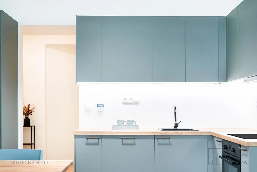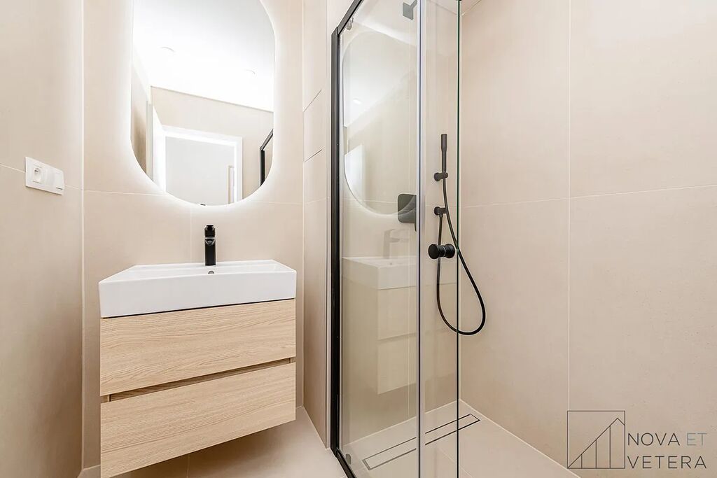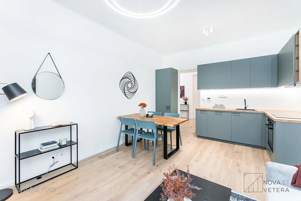 Interiér bytu právě prochází kompletní rekonstrukcí, která zahrnuje nové rozvody elektřiny, vody a odpadu, nové podlahy, obklady a dlažby italské značky Marazzi, stejně jako koupelnu a toaletu se sanitou Grohe. Součástí vybavení je kuchyňská linka na míru se spotřebiči prémiové značky Bosch. K dispozici je také návrh kuchyně pro lepší představu o jejím finálním vzhledu.