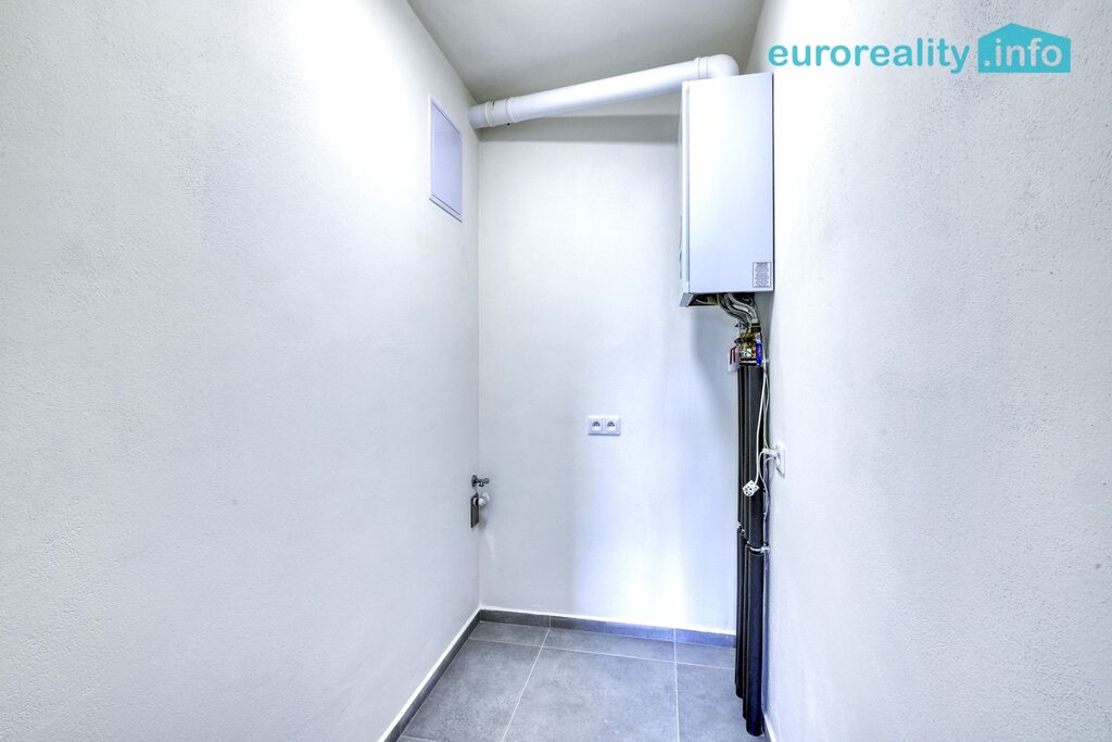 V obývacím pokoji je připravený komín s nasávání čerstvého vzduch zvenku pro instalaci krbových kamen, což přispěje k příjemné atmosféře, zejména v zimních měsících. Topení a teplou vodu zajišťuje kombinovaný plynový kotel s podlahovým topením, které vytváří komfortní prostředí.