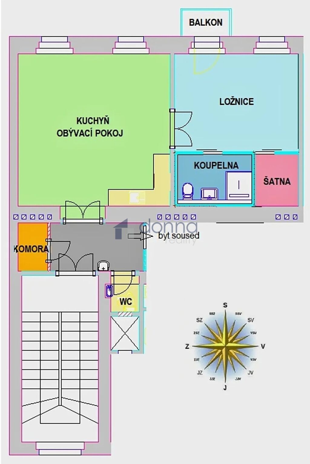 Dispozice: obývací pokoj s kuchyní (29 m²), ložnice (16 m²), koupelna s WC (5 m²), samostatné WC, šatna, komora a balkon.