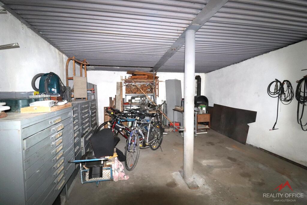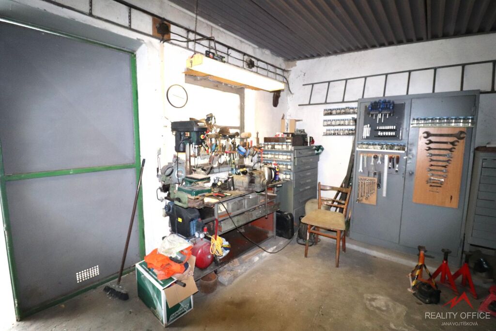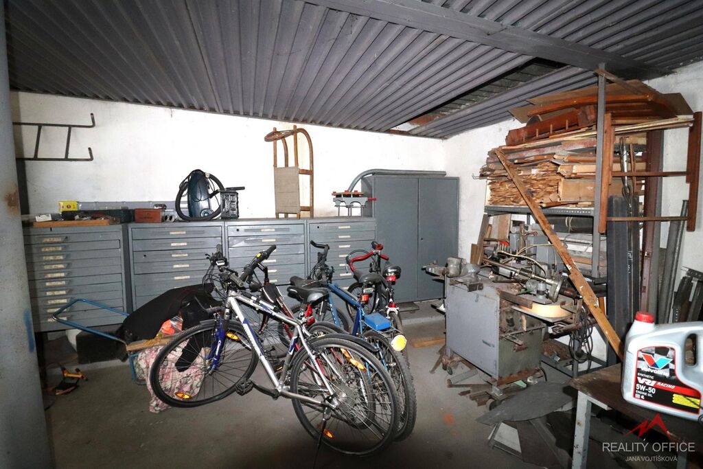 Zprostředkujeme prodej velké garáže o ploše 38m2, která může zároveň sloužit jako dílna nebo sklad. Garáž je zděná z cihel a panelů, má plechová vjezdová vrata 2.10m x 2m, střecha je vlnitý eternit + škvárobeton + ipa, podhled lisovaný plech, je zde velké okno 1m x 1m, podlaha betonová. Zavedená elektřina a vlastní elektroměr. Jsou zde krbová kamna k vytápění. Garáž se prodává včetně vybavení, je zde ponk, elektrický vrták, různé regály, skříň a mnoho nářadí.