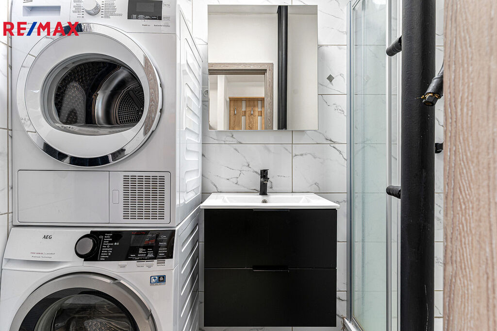 Byt se prodává včetně kompletního vybavení – v koupelně pračka a sušička, v kuchyni všechny spotřebiče, v obývacím pokoji pohovka a TV, v ložnicích postele (160×200 cm) a vestavné skříně.