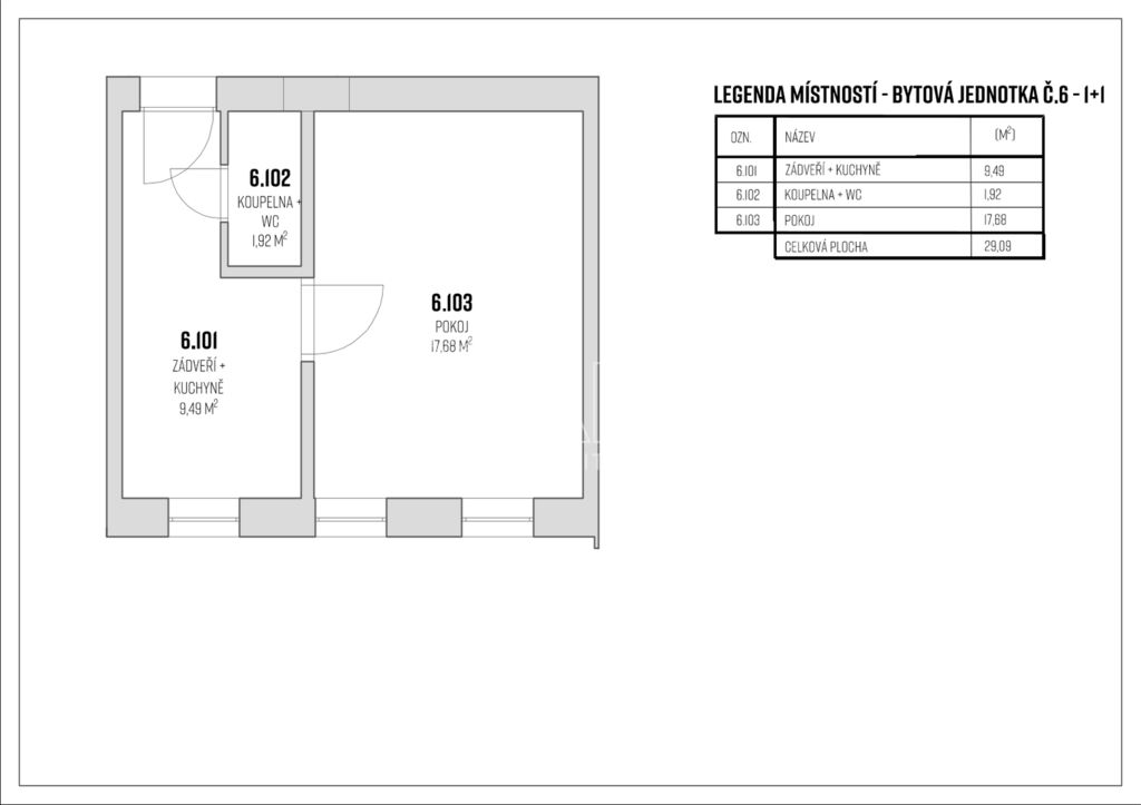 Byt se nachází ve 3. nadzemním podlaží a jeho celková užitná plocha je 29 m². K bytu dále náleží sklepní kóje o výměře cca 4,9 m². Orientace oken na západní stranu.