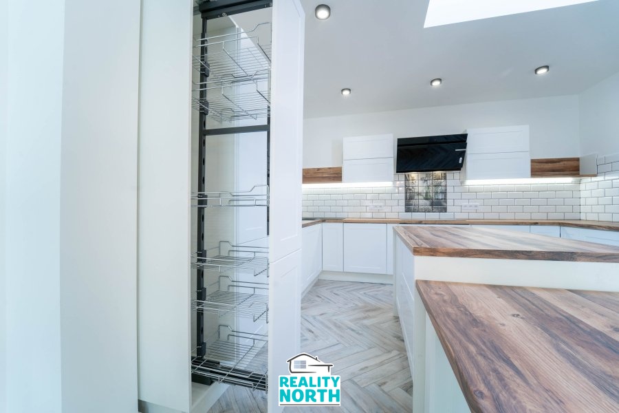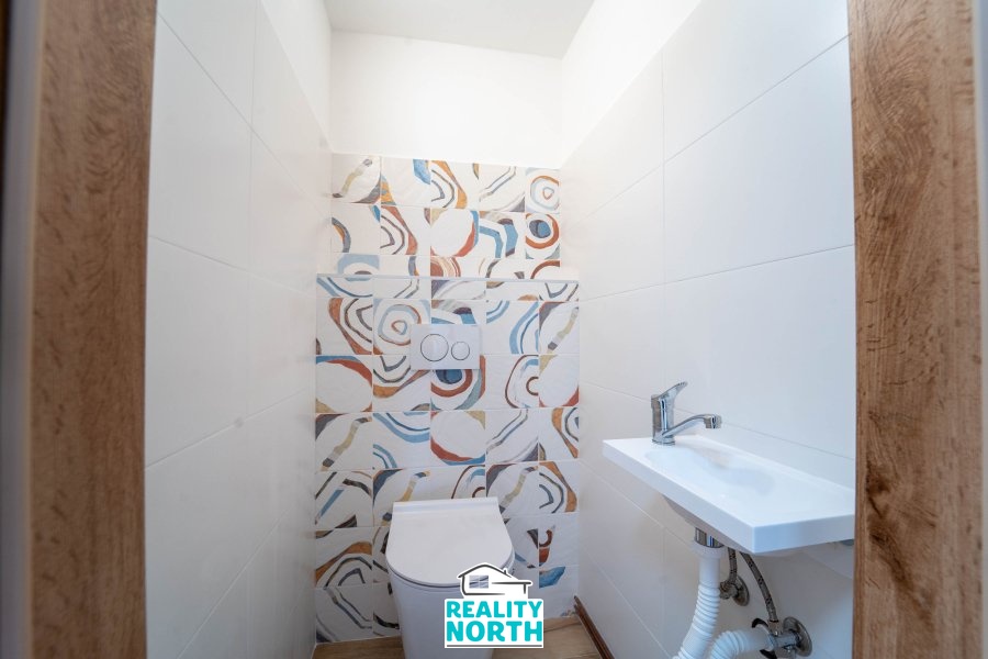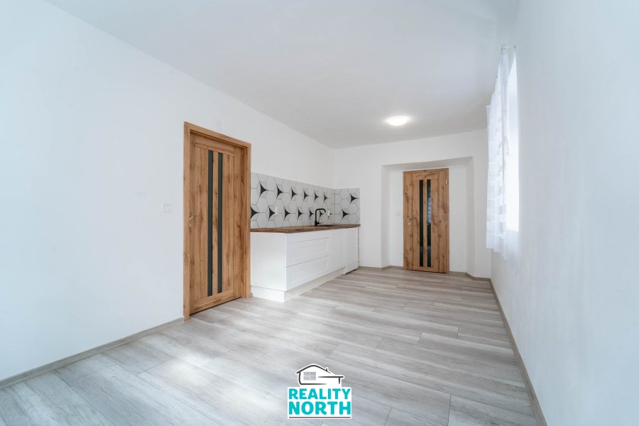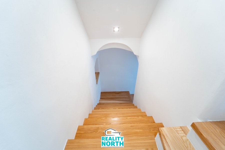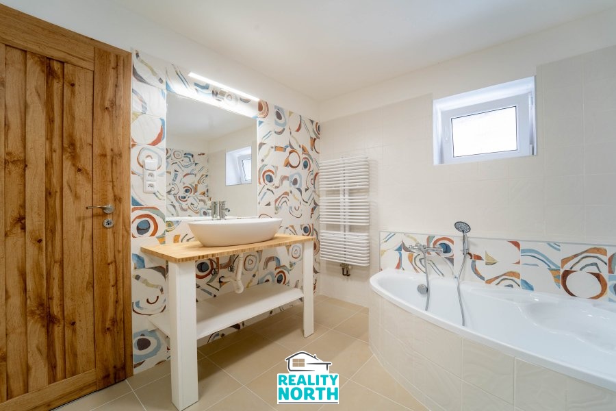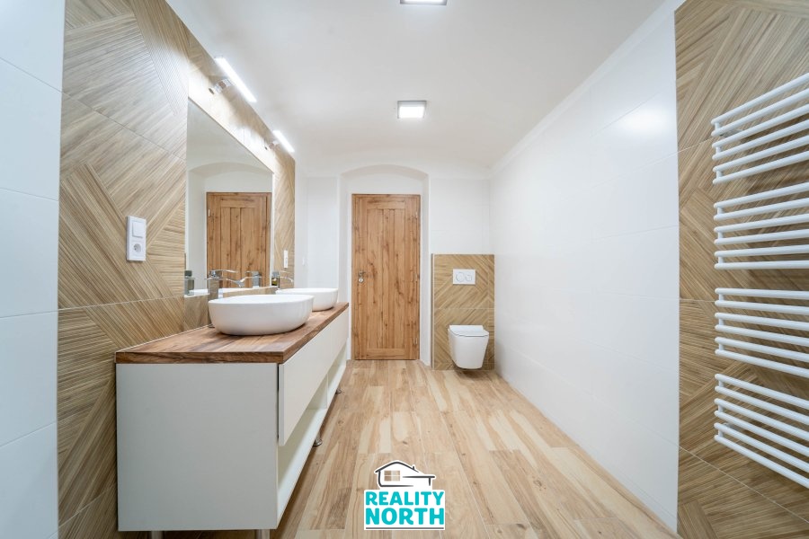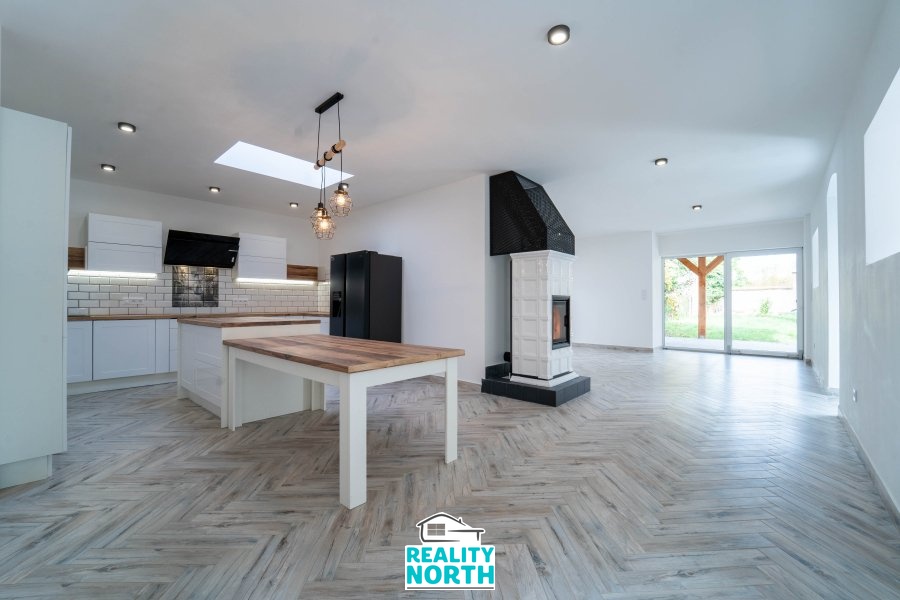 V levé části přízemí se pak nachází velká koupelna s toaletou, dvěma umyvadly a sprchovým koutem. Velkorysý prostor kuchyně s novými vestavěnými spotřebiči a plynule navazující obývací pokoj s kachlovými kamny. Tento prostor je zároveň vytápěn podlahovým topením. Z tohoto prostoru lze vstoupit na terasu a následně na zahradu.