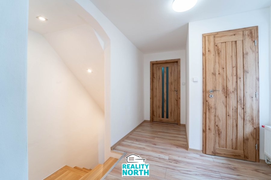 Do prvního patra vystoupáme po jasanem nově osazených schodech, do prostoru malé chodby se samostatnou toaletou určenou pro dva pokoje v pravé časti, využitelné jako dětské pokoje.
