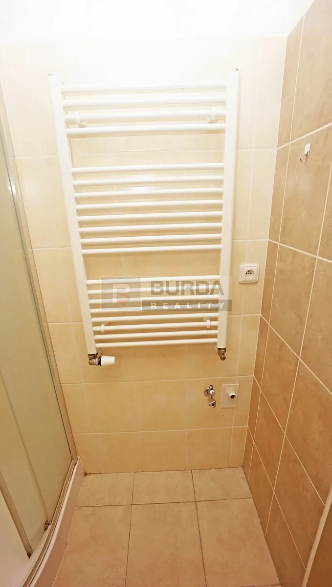 Koupelna je vybavena sprchovým koutem, topným žebříkem, zavěšeným WC, umyvadlem a zrcadlem.