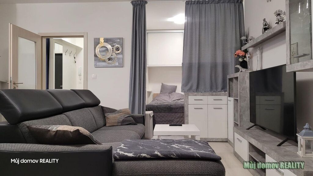 Dispozice bytu: vstupní chodba, moderní obývací pokoj s kuchyňskou linkou, ložnice,