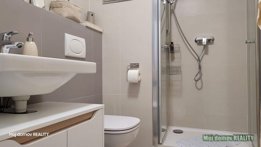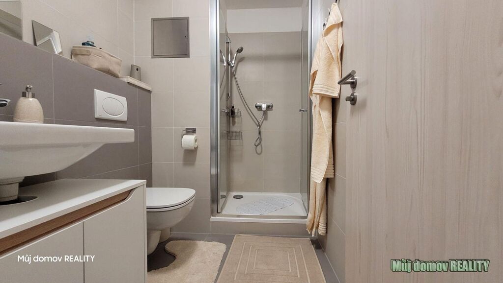 koupelna se sprchovým koutem, balkon 2 m garážové stání (v ceně), sklep 3 m, kočárkárna v domě.