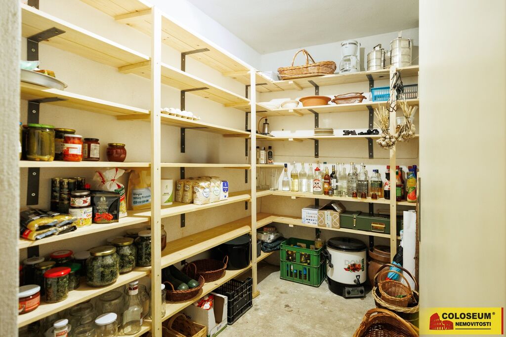 V suterénu se nachází garáž, dílna, sklep, kotelna sloužící jako technická místnost, prostorná spíž pro uskladnění potravin a také prádelna.