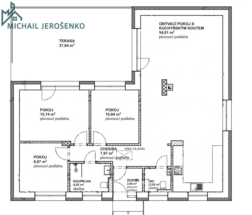 Světlý obytný prostor s kuchyňským koutem a přímým vstupem na terasu (37 m2)