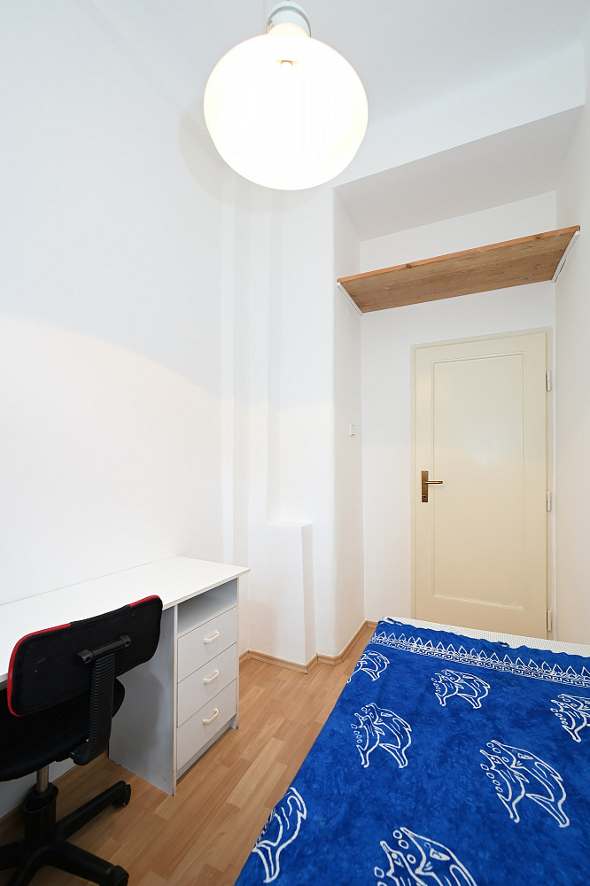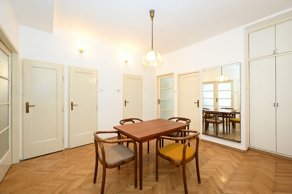 We offer for rent a very nice, spacious and fully furnished apartment in a house constructed in 1930's near Náměstí Jiřího z Poděbrad with a view of Plečnik's Church of the Sacred Heart of Jesus and in the immediate vicinity of the Metro A and tram stops. It is situated on the 2nd floor with elevator in a quiet street. Living area 82m² with central heating - two large living rooms with separate entrances from the living hall, this part of the apartment with wooden parquet floors, spacious, bright and fully furnished kitchen with appliances and washing machine, living hall in the middle of the apartment connects separate rooms with glass doors, children's room, bathroom with whirlpool massage bathtub, toilet and pantry/storage space. The apartment includes an open balcony, small hallway, apartment doors are eqipped with security lock. There are furniture, TV and built-in wardrobes for the tenant at his disposal.