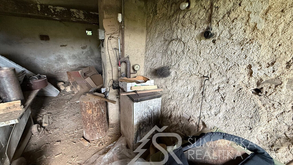 Na obytnou část navazuje garáž s umístěným starším, avšak funkčním kotlem, a také prostorná stodola, která nabízí další úložné či dílenské zázemí.