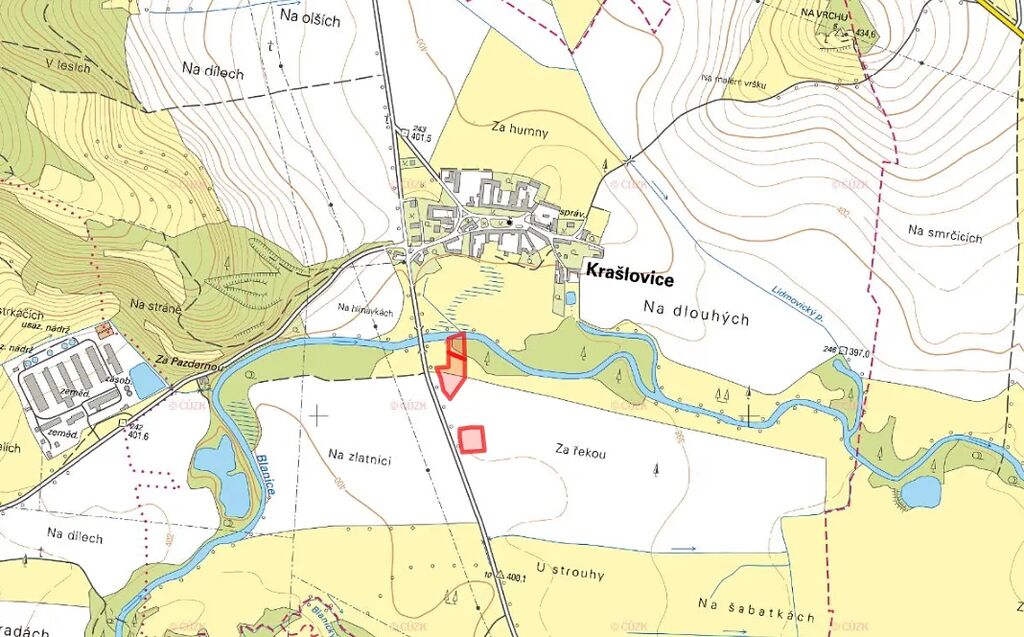 V katastrálním území Krašlovice, okres Strakonice, nabízím k prodeji soubor pozemků ve výlučném vlastnictví. Pozemky jsou zapsány na listu vlastnictví č. 306 a tvoří je celkem tři parcely.