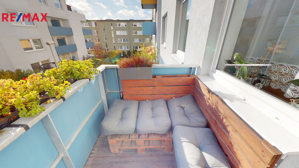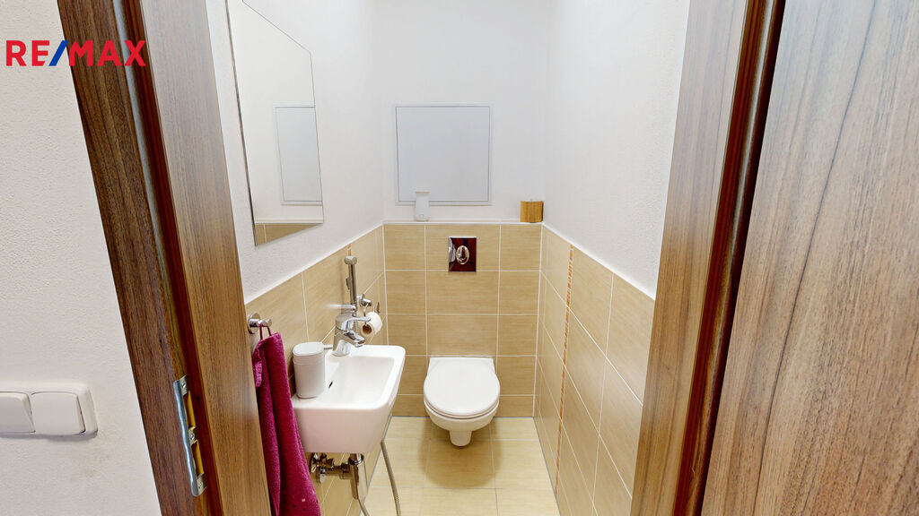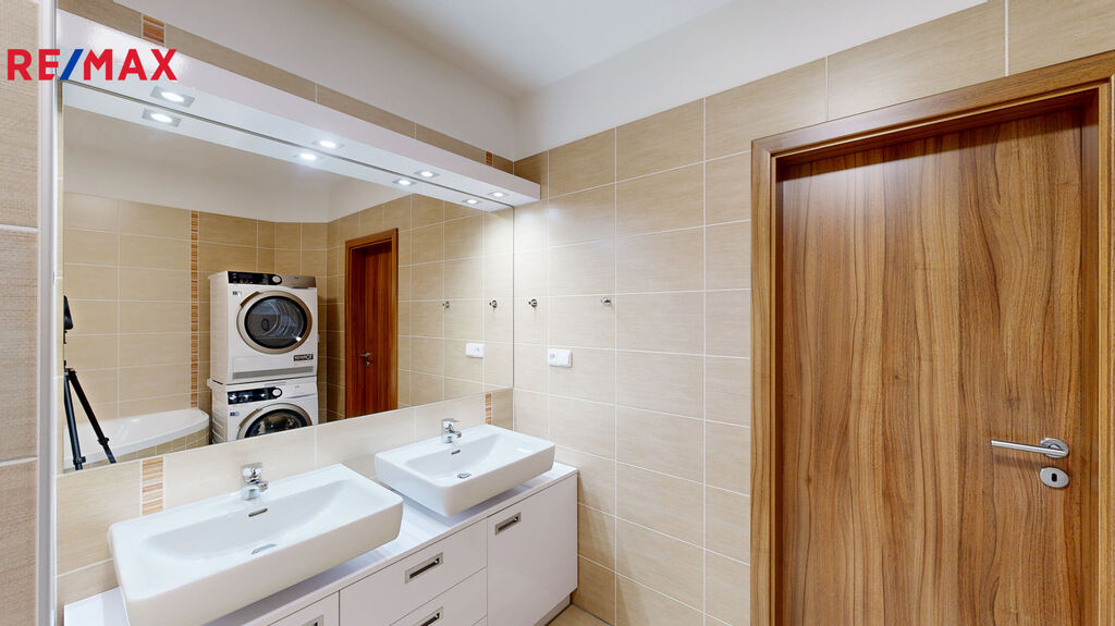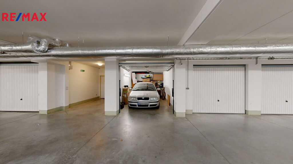 Dále k bytu náleží sklepní kóje o výměře 3 m2 a uzavřená garáž v 1.PP bytového domu o velikosti 18 m2. Garáž je situavaná v těsné blízkosti výtahu. Má výsuvná vrata značky Hormann, na dálkové ovládání.