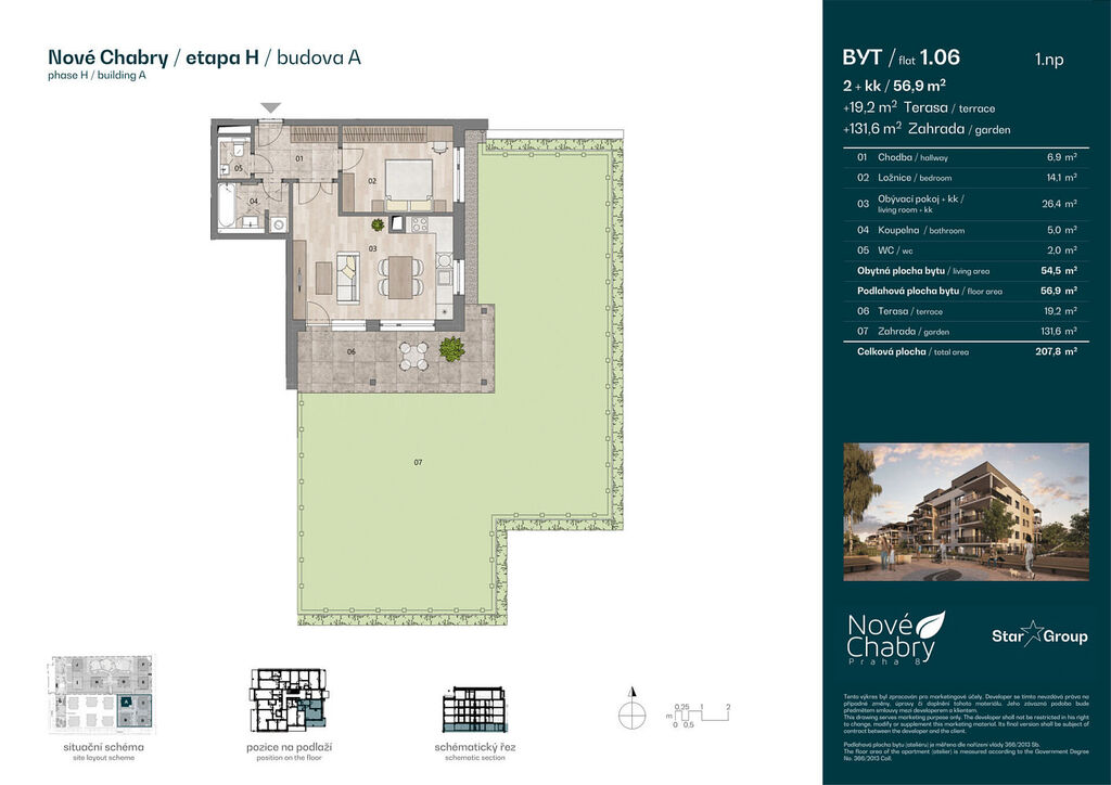 Moderní 2+kk s terasou 19,2 m² a zahradou 131,6 m² – nastěhování 2026
