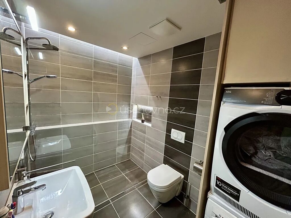 Koupelna (velká sprcha s walk-in, umyvadlo se skříňkou, zrcadlová skříňka, topný žebřík, závěsné WC, chromový program).