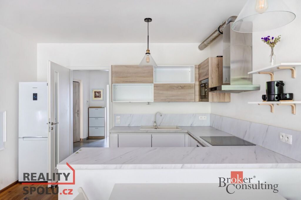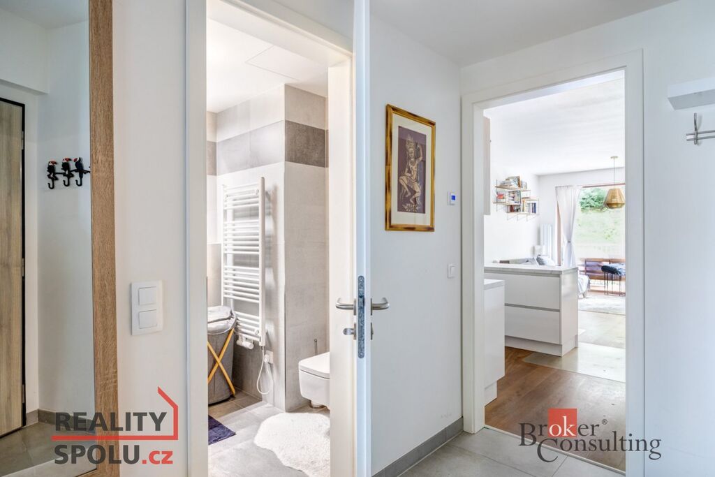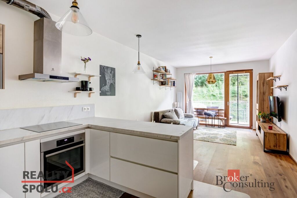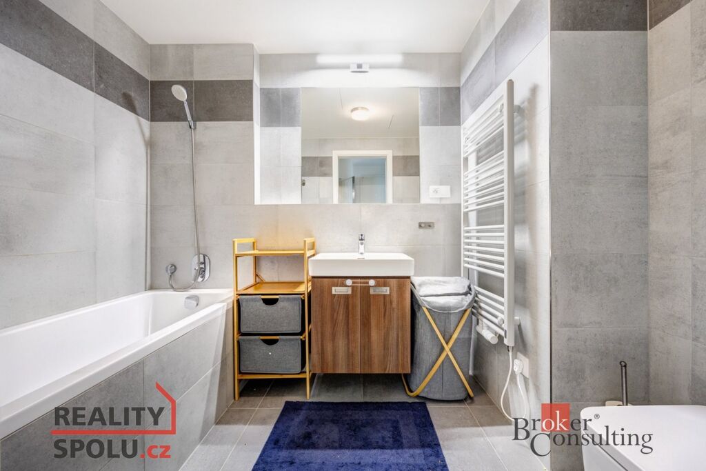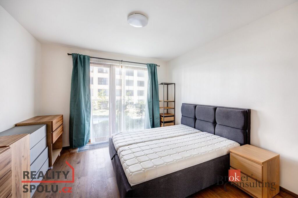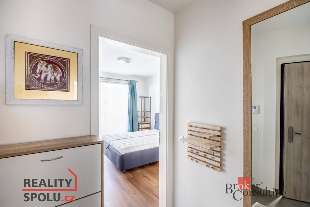 Byt je situován ve 2. patře novostavby. Interiér bytu tvoří útulný obývací pokoj s krásnou světlou kuchyní, která je plně vybavena kuchyňskou linkou, vestavěnou elektrickou troubou, mikrovlnou troubou a myčkou nádobí. Obývací pokoj je též vybaven a připraven k užívání, ať už ke sledování Vašich oblíbených pořadů či k relaxaci. Ložnice disponuje manželskou postelí, vestavěnou skříní a úložnými prostory. Nabízí výhled do vnitrobloku, kde se nalézají dětská hřiště a velké množství zeleně. Koupelna zařízena vanou a spojena s toaletou. V technické místnosti je vhodně umístěna pračka se sušičkou, která je též součástí vybavení bytu. Byt celkově působí velmi vzdušně a příjemně. Sousedství je zde velmi příjemné a přátelské, panuje zde příjemná a klidná atmosféra. K bytu patří jedno garážové stání v podzemních garážích a sklep. Lze využít i společnou kočárkárnu, například k uložení kola apod. Celý objekt je uzavřen, k přístupu do objektu je potřeba čip.