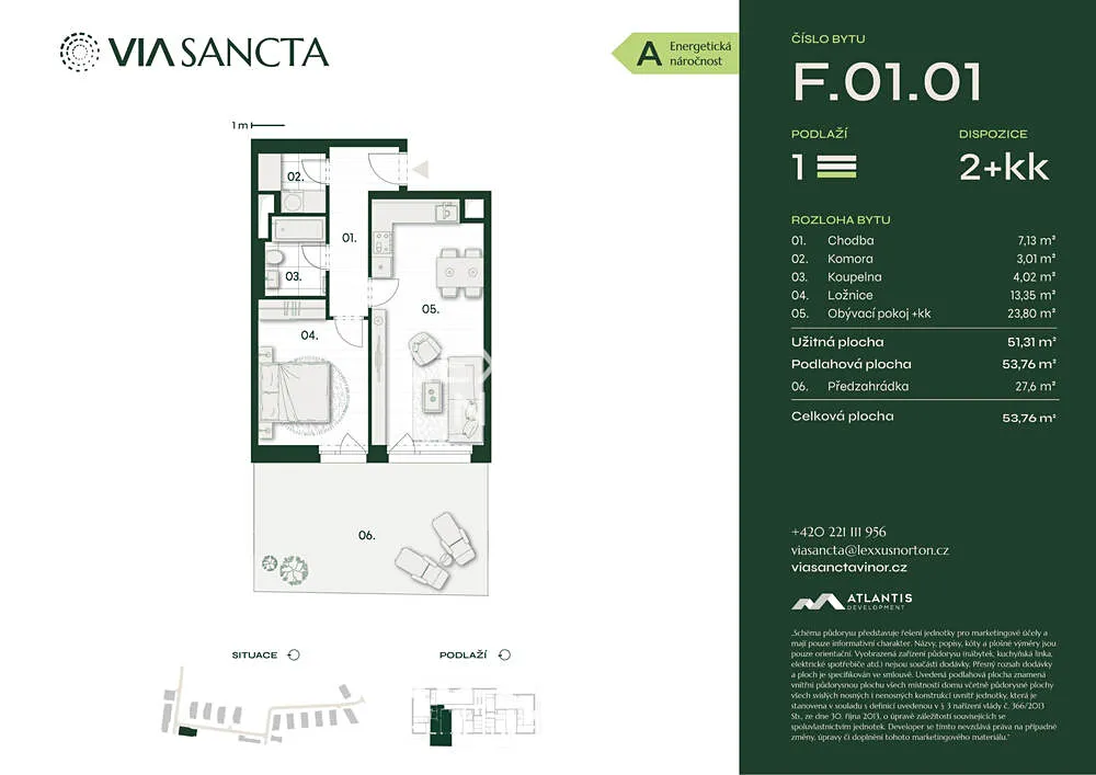 Dominantou tohoto bytu 2+kk o ploše 53,76 m² je velkorysá předzahrádka o rozloze 27,6 m² s krásným výhledem na golfové hřiště. Do zahrady vede přímý vstup jak z obytného prostoru s kuchyňským a obývacím koutem, tak z ložnice, což vytváří příjemné propojení interiéru s exteriérem. Dispozici doplňuje chodba s úložným prostorem, komora a koupelna se sprchovým koutem. Praktické zázemí zajišťuje sklepní kóje a možnost garážového i venkovního parkování.