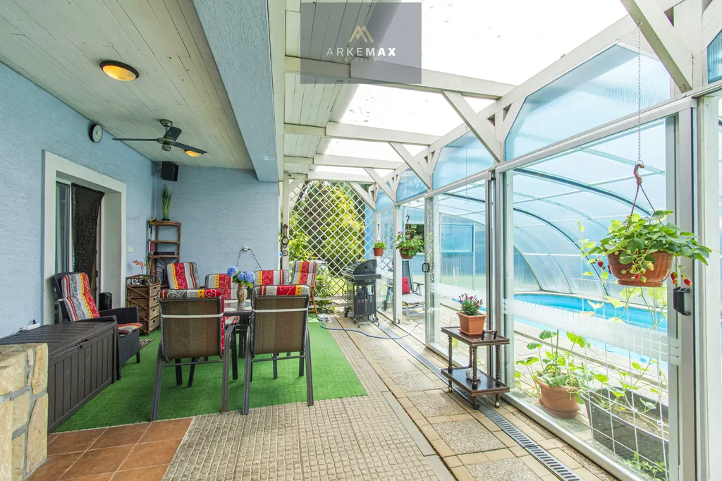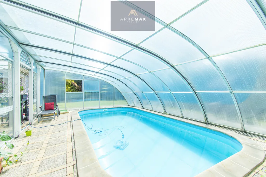 Na zahradě o rozloze 1267m2 najdete vše, co dělá domov domovem. Krytý bazén pro letní osvěžení, zahradní domek, ovocné i okrasné stromy a také zastřešenou terasu s krbem, ideální pro večerní pohodu s rodinou i přáteli. Nechybí ani samostatná garáž pro dva vozy a zastřešená pergola pro další dvě stání, takže o parkování máte postaráno.