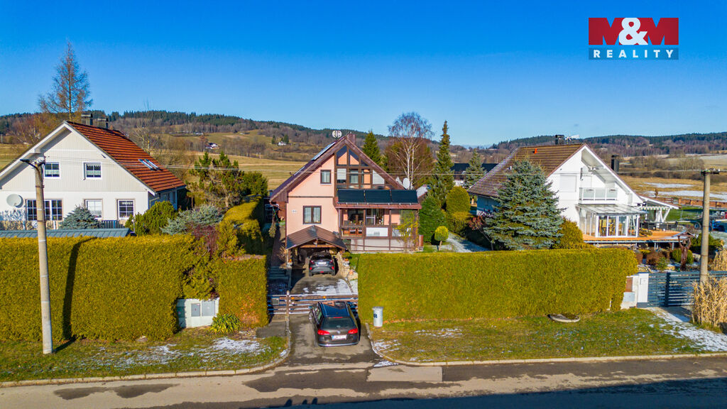 Nabízíme k prodeji prostorný rodinný dům 5+1 ve vyhledávané a klidné lokalitě ve Volarech. Dům je na prodej včetně vybavení. Nemovitost stojí na vlastním pozemku o 1 446 m², zastavěná plocha 100 m², užitná plocha 280 m². Dům z roku 1992 je průběžně rekonstruován – plastová okna, nová střecha, fasáda, prosklené lodžie, solární panely s bateriovým úložištěm, solární ohřev vody a tepelné čerpadlo. Dům je kompletně podsklepen: garáž, dílna, prádelna, kotelna a technické místnosti. V přízemí je velký obývací pokoj, kuchyně, pokoj, koupelna s masážním sprchovým koutem, WC a chodba. V podkroví tři pokoje, lodžie, balkon, koupelna s vanou a WC. Vytápění: tepelné čerpadlo napojené na solární panely, kotel na TP. IS: elektřina 220/380 V, obecní vodovod, kanalizace, na pozemku i studna. Součástí pozemku je skleník, kůlna, včelín a udržovaná zahrada. V obci kompletní občanská vybavenost. Pro více informací nás neváhejte kontaktovat.