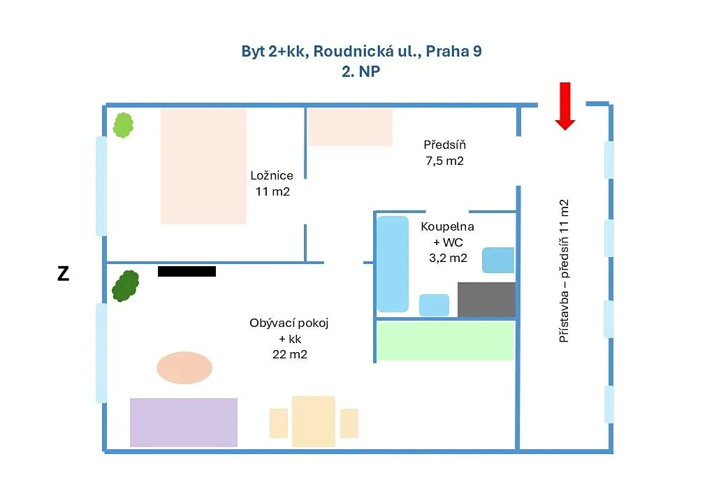 Velkou přidanou hodnotou je další přičleněná prosvětlená předsíň k bytu původně sloužící jako společná chodba v domě. Díky tomu umožňuje předsíň vybudovat více úložného prostoru nebo vytvořit např. pracovní kout.