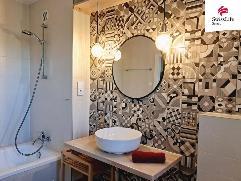V koupelně najdeme pračku i sušičku, nad nimi praktický odkládací prostor. Vyhřívaná podlaha zde je milý bonus.