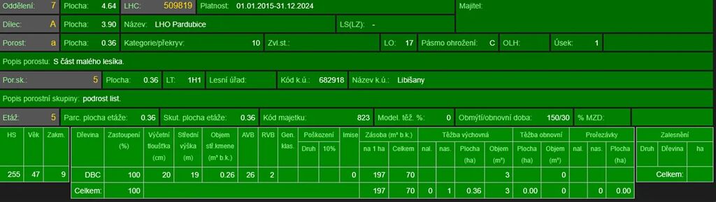 - p.č. 1106 vedená jako lesní pozemek o celkové výměře 3 605 m2 (stáří lesa 57 let - zastoupení dřevin dub)