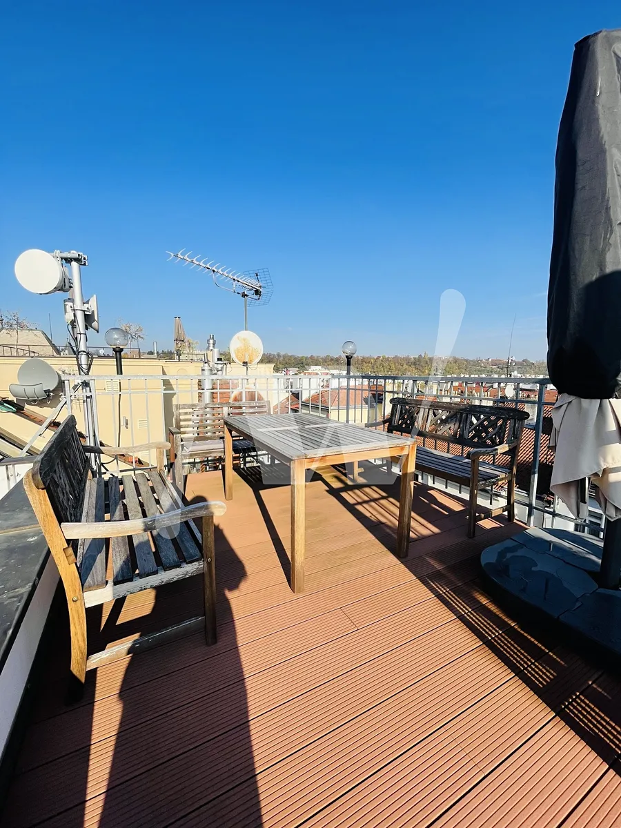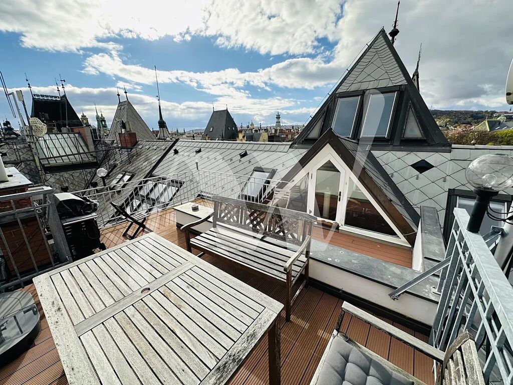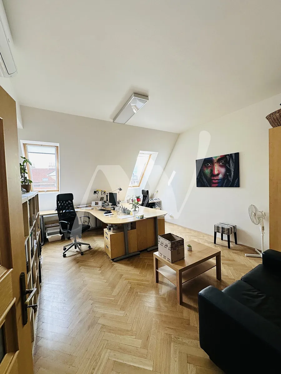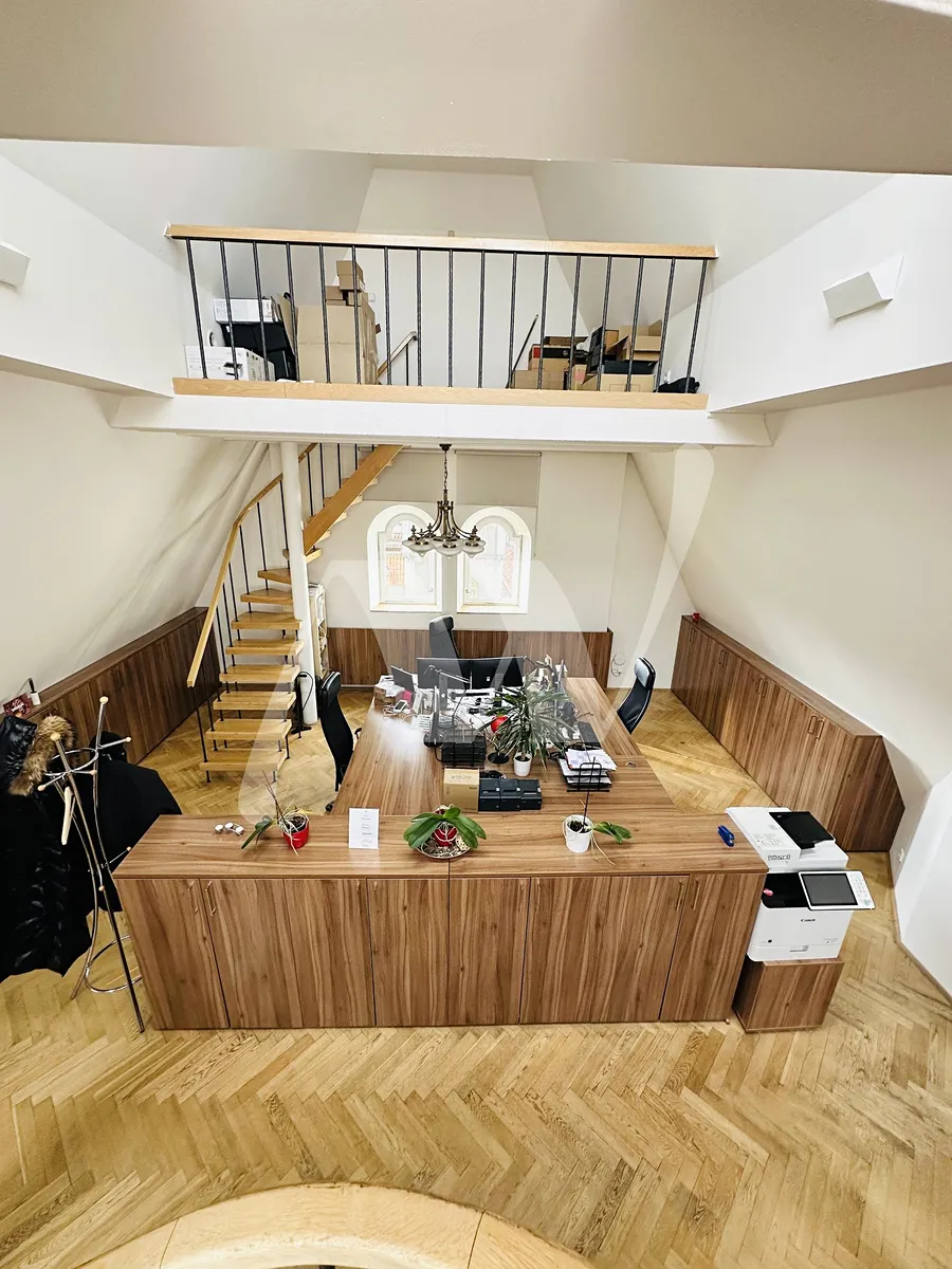 Nabízíme k pronájmu unikátní mezonetovou kancelář s klimatizací a soukromou terasou s výhledem na Pražský hrad.