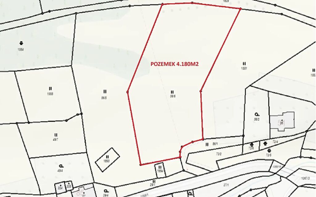 Pozemek je svažitý, orientovaný na jih a z jeho horní části se otevírá krásný výhled do údolí a okolní krajiny. Přístup je zajištěn přes pozemek parc. č. 56/1, kde je zřízeno věcné břemeno příjezdu a přístupu.