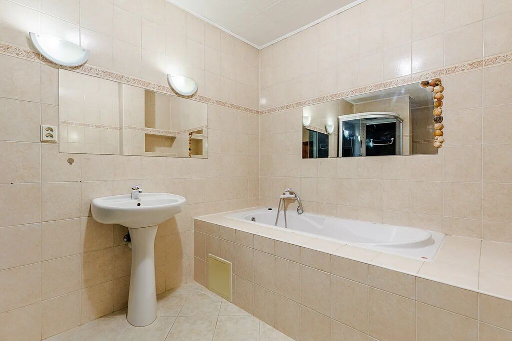 Středobodem celého domu je velký obývací pokoj 35,5 m2 s jídelním koutem 13 m2 a samostatnou kuchyní 1,8 m2 s dřevěnou kuchyňskou linkou vybavenou sporákem s horkovzdušnou troubou, nerezovým dřezem a samostatnou lednicí s mrazákem. Součástí dispozice je dále ložnice rodičů 15.5 m2 s průchozí šatnou 7,4 m2, dětský pokoj 20,2 m2, koupelna 11 m2 s vanou, masážním sprchovým koutem, umyvadlem a toaletní mísou, předsíní 4,5 m2 a vstupní halou 8,8 m2.